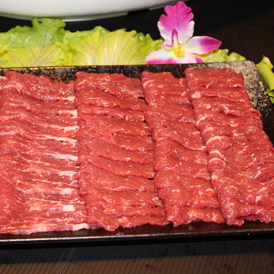精選牛隻油花分布均勻的部位,肉片用熱湯輕涮5秒成粉嫩色最能享受牛肉的入口即化。