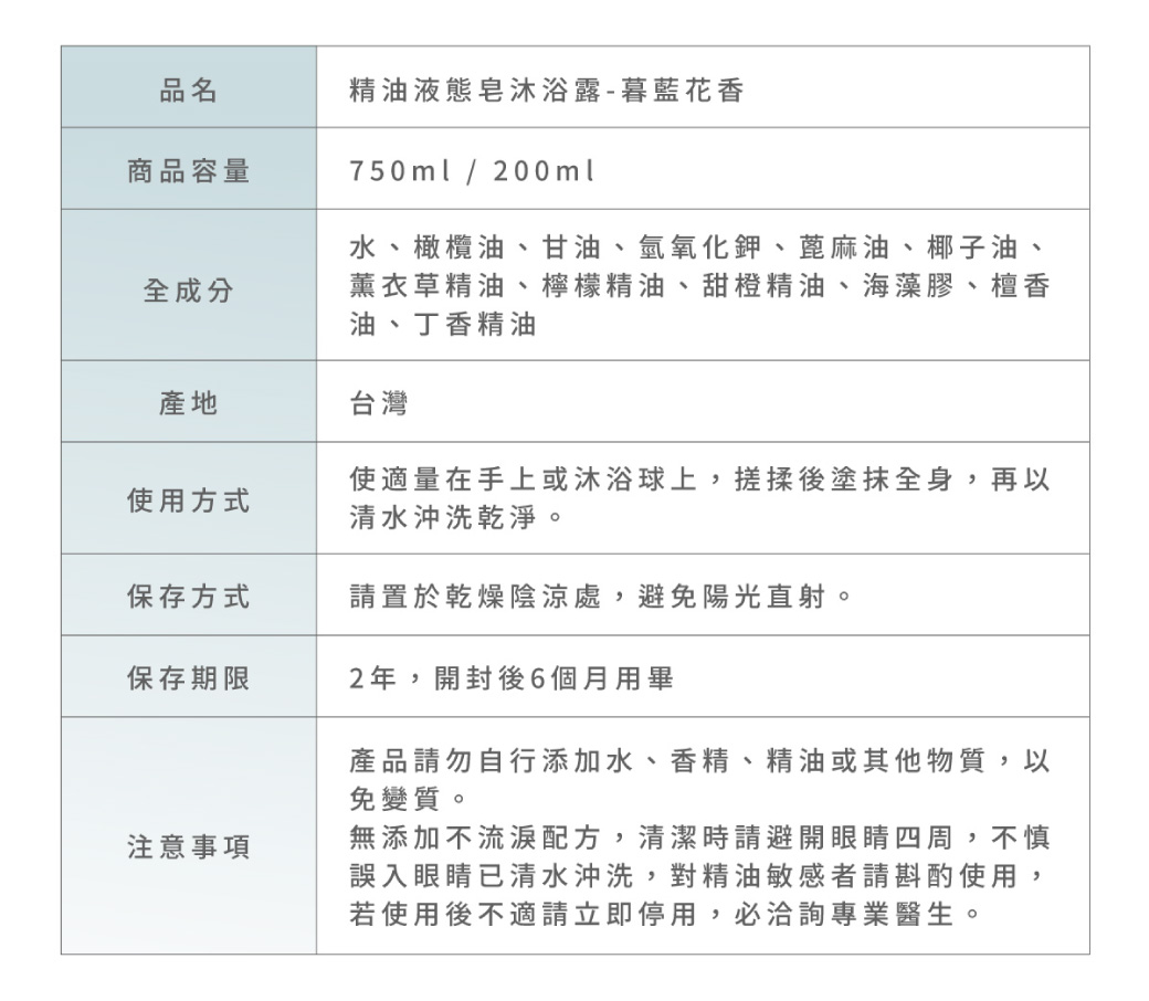 ▪全成分:水、橄欖油、甘油、氫氧化鉀、蓖麻油、椰子油、薰衣草精油、檸檬精油、甜橙精油、海藻膠、檀香油、丁香精油