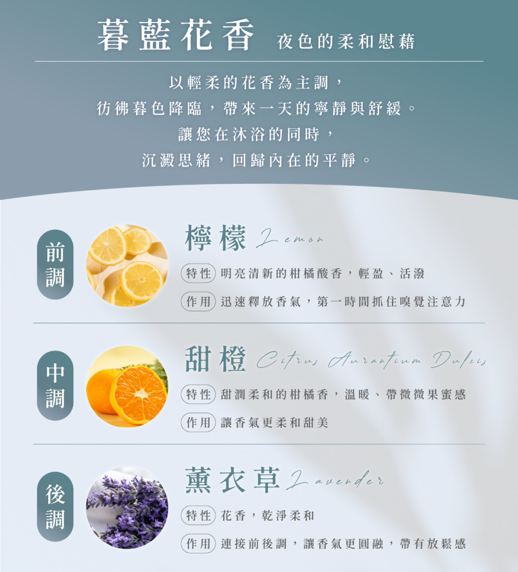 以輕柔的花香為主調,彷彿暮色降臨,帶來一天的寧靜與舒緩。讓您在沐浴的同時,沉澱思緒,回歸內在的平靜。