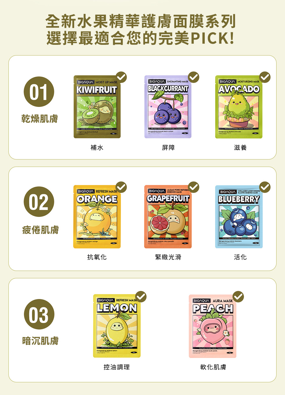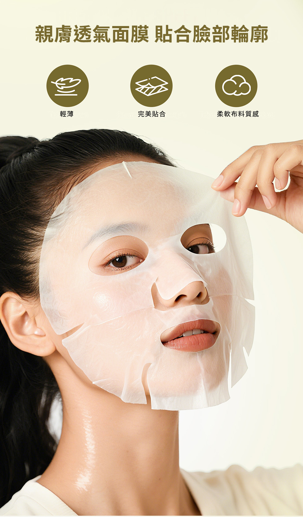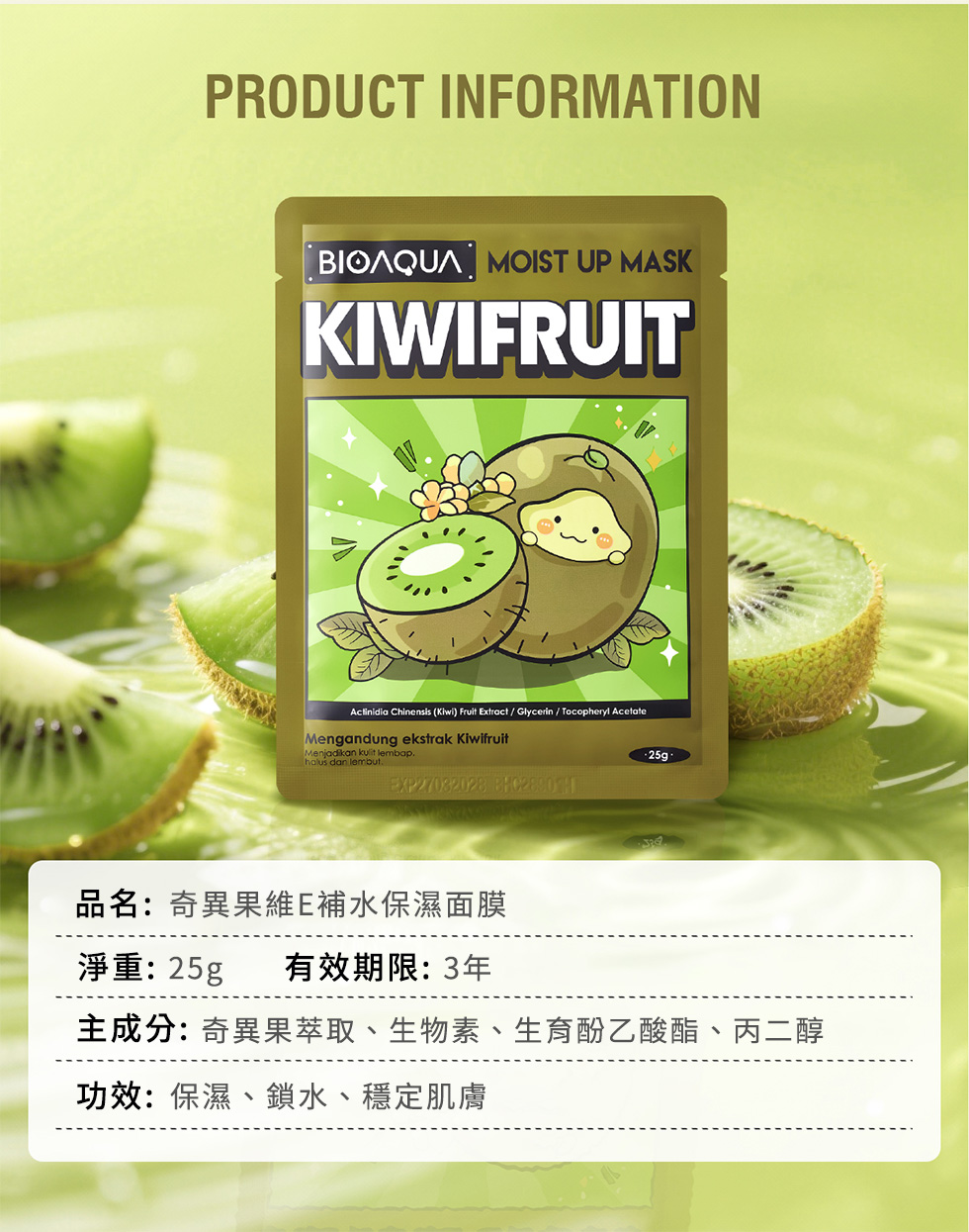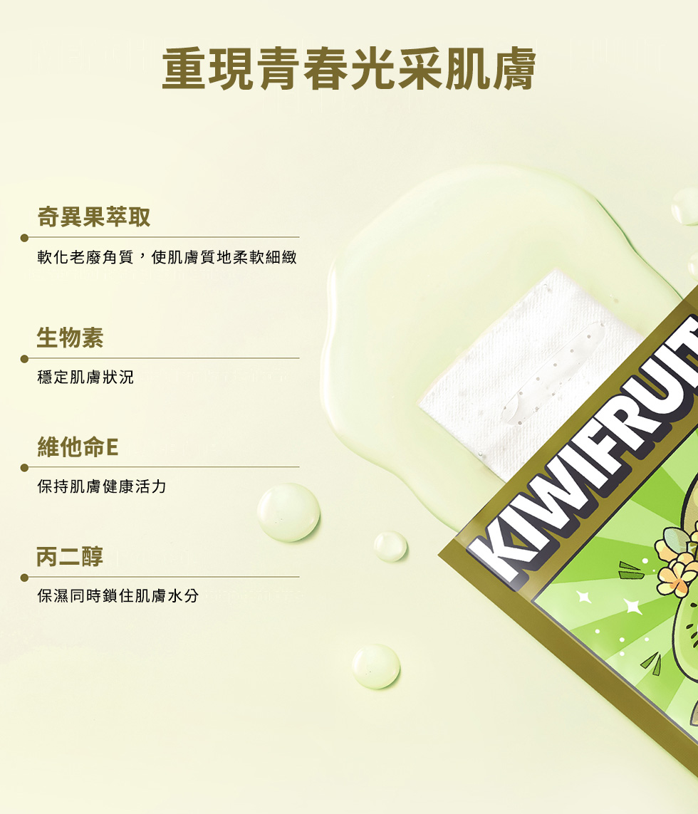 含奇異果萃取、維他命E、生物素,潤澤肌膚同時鎖住水分,讓肌膚光滑、柔軟,適合乾燥肌膚。親膚透氣面膜布,360°貼合臉部肌膚,幫助精華滲透肌底。