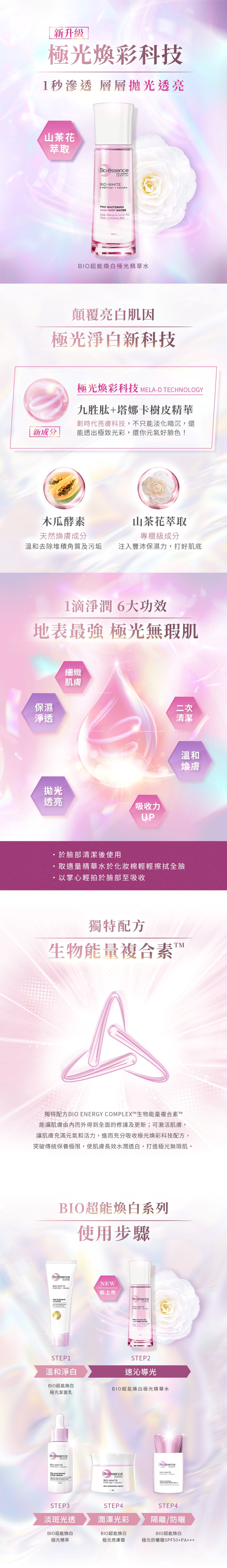 分子細小能快速將有效成分帶入肌底、層層滲透至肌底淨白肌膚,質地輕爽易於吸收,有效美白與均勻膚色,提升後續保養品的吸收力和續航力。