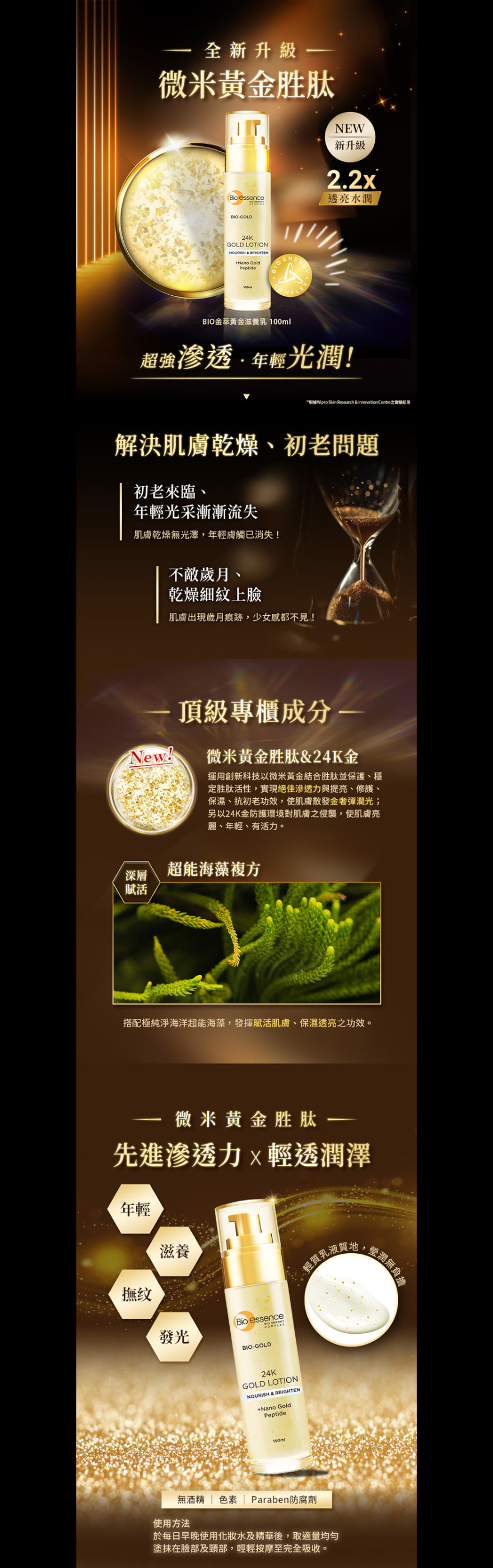 蘊含24K BIO黃金滋養成份,融合多種植物萃取精華,質地水潤溫和,滲透保濕滋潤肌膚,幫助細緻毛孔,有效提升肌膚水潤度及亮澤感;同時,淡化肌膚歲月痕跡,喚醒肌膚柔嫩滑亮,達到減齡效果。