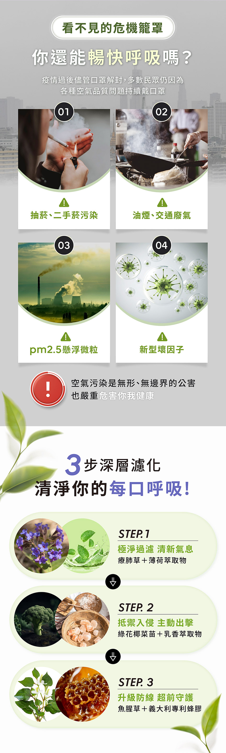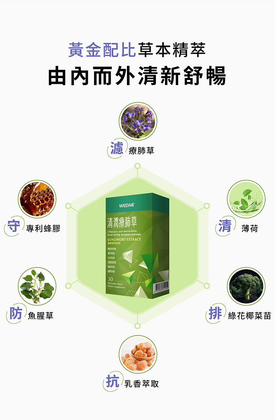 清淨你的每口呼吸!由內而外清新舒暢,草本黃金配比| 療肺草、薄荷、綠花椰菜苗、乳香萃取、魚腥草、專利蜂膠,守護呼吸防線,享受深層極淨。