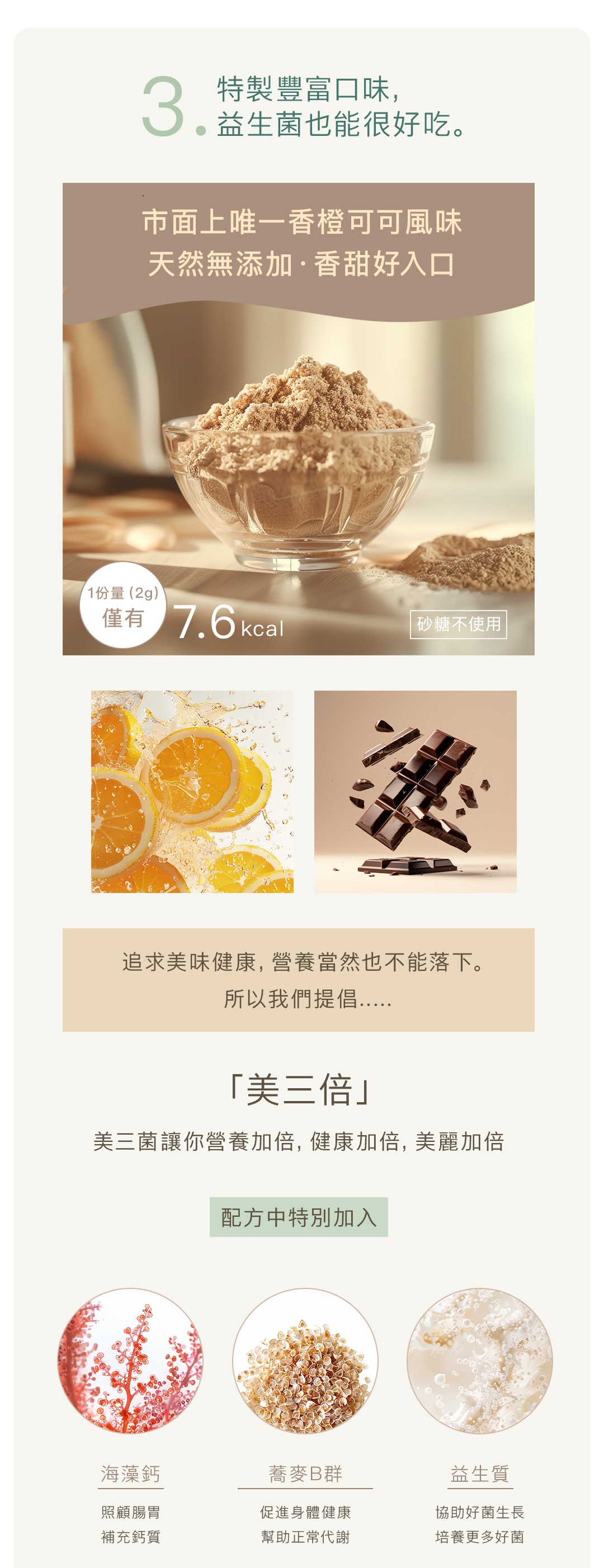 採用益生質、蕎麥B群及海藻鈣,組成+3完美組合
