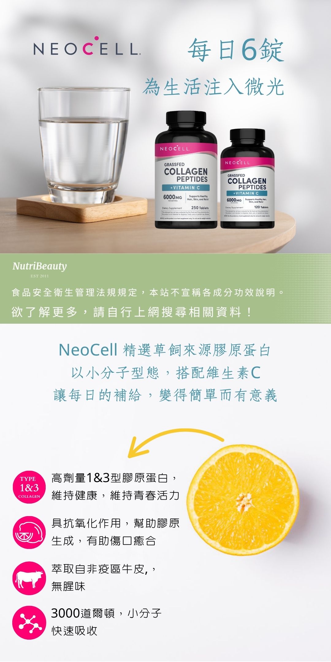 嚴選草飼牛來源,每份提供 6000 毫克 BioActive NeoCell® 膠原蛋白胜肽™。搭配維他命 C,錠劑設計讓每日補給更簡單、更好持續。