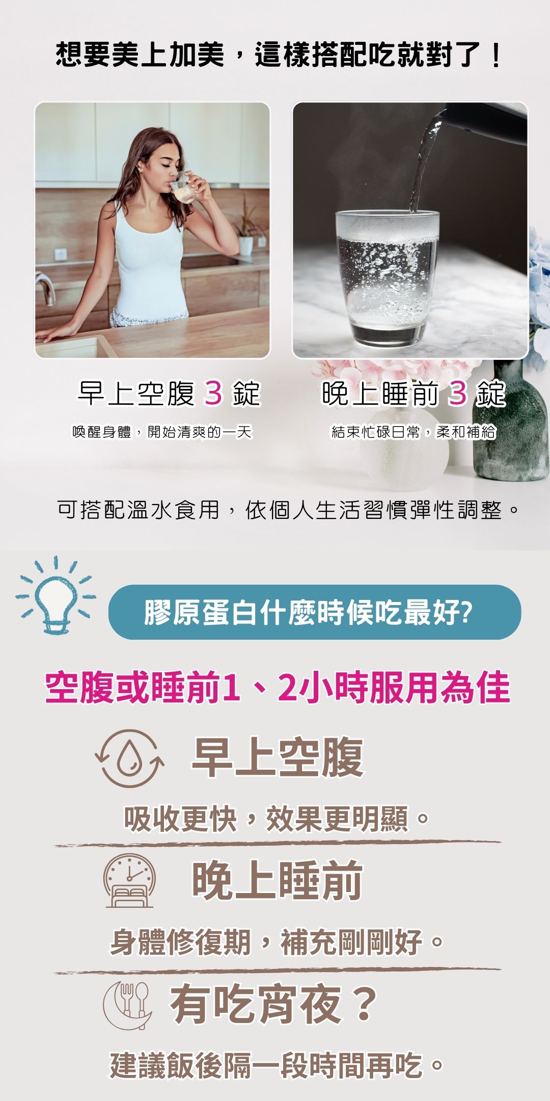 📌 可於 早上飯前 20 分鐘空腹,或 晚上睡前 食用。