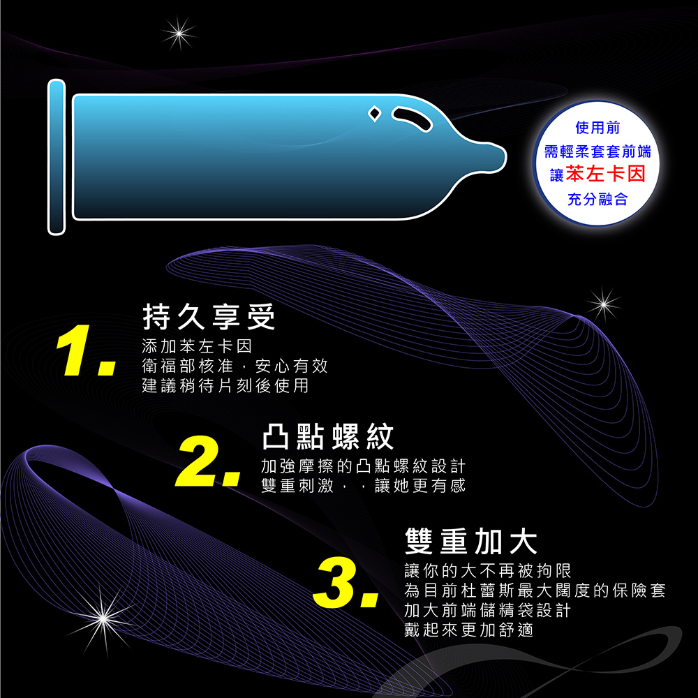 本產品為一次性用途,用完請丟棄勿再重複使用。本產品乃針對陰道性交設計,若使用於非陰道性交時,滑落或破損的機率會提高。目前任何一種保險套皆不能100%有效避孕及預防感染性病及愛滋病。本產品原料為天然橡膠製成之乳膠,對乳膠過敏者, 請避免使用。