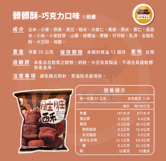 過敏原資訊:本產品含麩質之穀物、牛奶,不適合其過敏體質者食用。