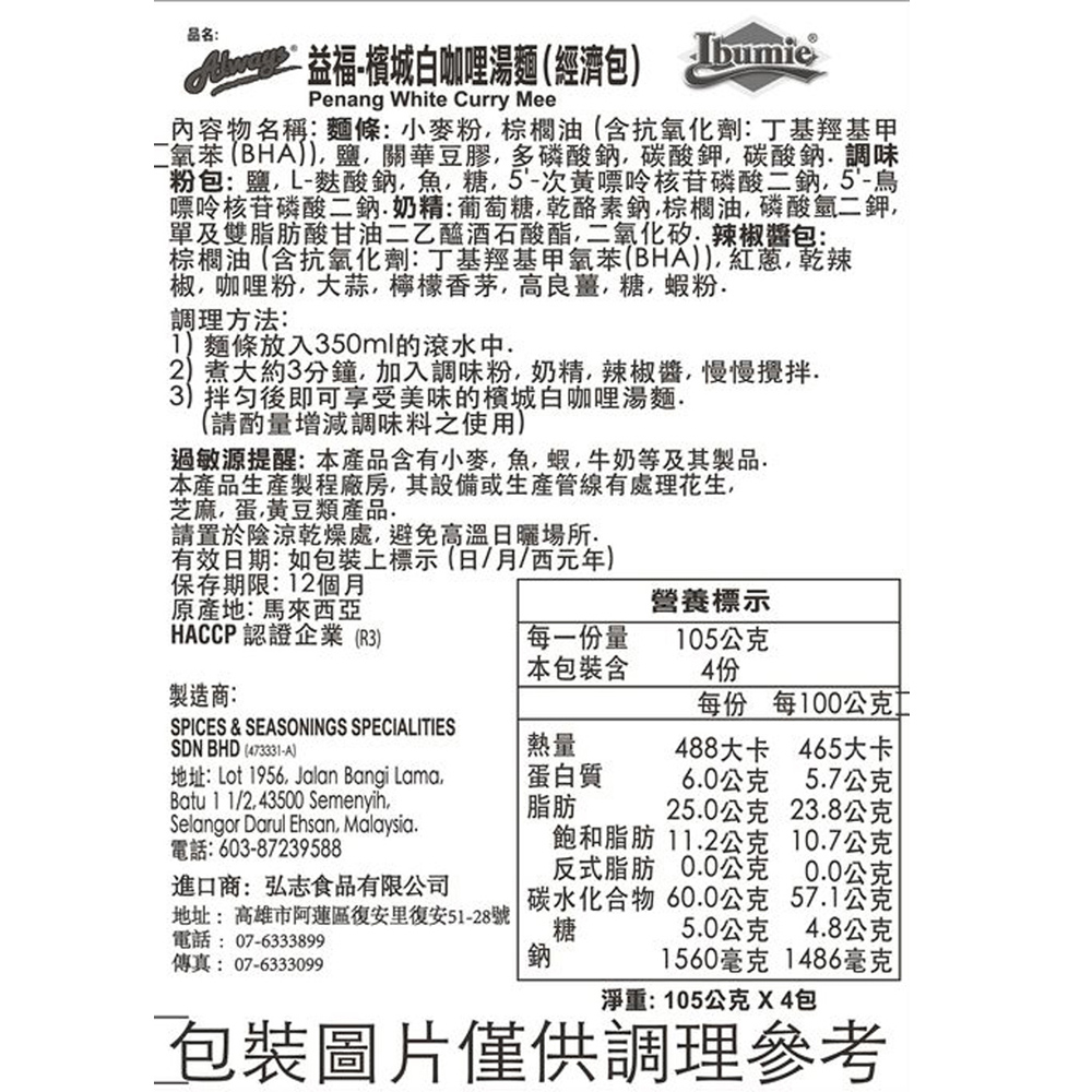 [惜福品促銷26.03.27]東南亞風味 火鍋季好物 冬季必吃Ibumie 益福檳城白咖哩湯麵(經濟包)(105g*4P) 濃郁椰奶香氣 超夯白咖哩泡麵 [8袋免運組]