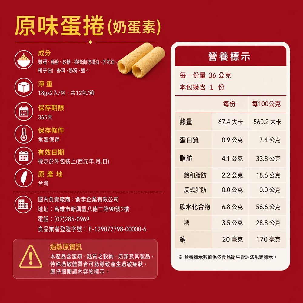 本產品含有蛋、含麩質之穀物、大豆、牛奶及其製品,特殊過敏體質者可能導致產生過敏症狀,消費者如對該成分過敏應仔細閱讀內容物標示。※本產品製程廠房,其生產設備或管線有處理花生、芝麻、堅果類、魚類及其製品。