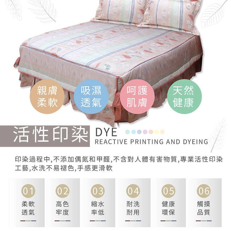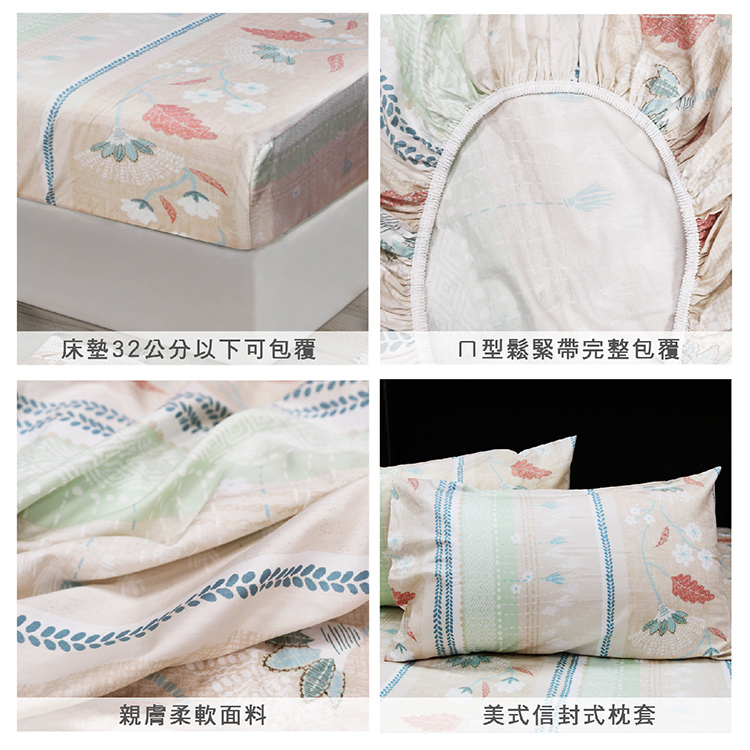 ★特色:★台灣製精梳棉床罩組採用100%絲光精梳棉布,經多重絲光及壓光後處理製成。★質地細緻、觸感極佳,充滿溫柔舒適感的寢飾風格設計,充分表現出現代寢具商品重視室內空間搭配、視覺感受的需求。★色澤鮮豔立體、柔軟舒適,前後車縫鬆緊帶設計,不易脫落。★採用環保染劑印染布料,不刺激皮膚、不褪色,不縮水,不起毛球,讓您能安心使用★整組床組精密的做工,觸感極為柔細而舒適,在每個夜晚都細細的呵護著您的肌膚★精心挑選設計的花色,色澤穩定經久耐洗品味與質感兼具環保健康的寢具★台灣知名大廠印染不易退色、不易勾紗、永保色彩鮮麗★三大保證:保證品質嚴選-100%台灣製造保證色彩鮮明不易褪色保證不易起毛球,100%高級純棉觸感,質感佳透氣及吸汗功能★清洗容易、收納方便,透氣舒適,提升睡眠品質★以平實的價位提供消費者高品質的寢具選擇,擁有舒適品味的居家生活★使用環保無毒之染劑,甲醛螢光劑符合安全標準★台灣製造,品質保證,清洗容易、收納方便,透氣舒適,提升睡眠品質。