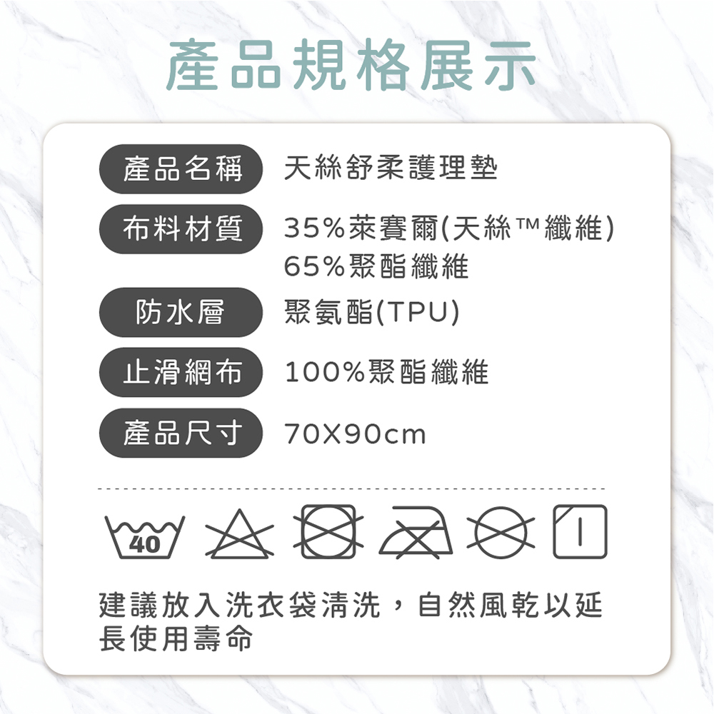 品名:【Pure Sleep 純好眠】天絲舒柔護理墊-二入組布料材質:35%萊賽爾(天絲纖維)、65%聚酯纖維防水層:聚氨酯(TPU)止滑網布:100%聚酯纖維尺寸:70*90CM(±2cm)產地:台灣經銷商:茂榕數位科技有限公司地址:桃園市平鎮區廣東路57巷1號電話:0800-666865【注意事項】※商品圖片為實物拍攝,由於螢幕顯示色差、拍攝光線等因素,照片與實物可能略有差異,請以實物為準。※商品尺寸為人工測量,標示僅供參考,難免與實際商品尺寸略有誤差,誤差尺寸±2cm為國際驗貨標準可接受範圍。※拆封商品後,若有任何問題請先聯繫客服,將有專員為您服務。※注意! 以下說明不屬瑕疵範圍:1. 小於1-3cm尺寸測量誤差、些微不對稱2. (1cm極小污點/摺痕/刮痕/螢幕色差等3. 些微脫線/勾針/線頭/味道/五金刮痕4. 人為造成損壞或使用痕跡