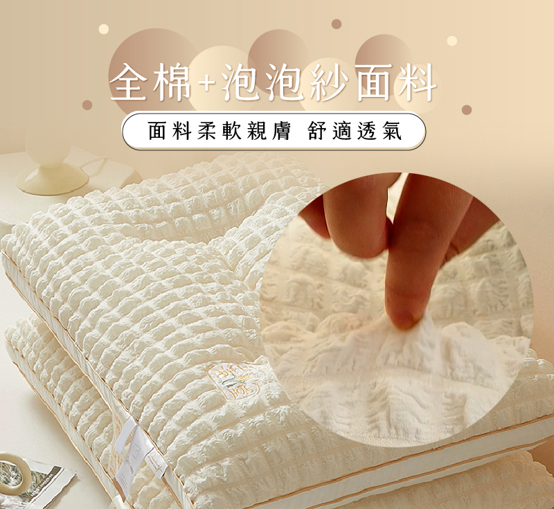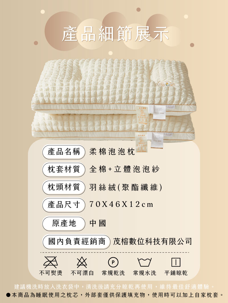 品名:【Pure Sleep 純好眠】柔眠泡泡枕-二入組面料材質:全棉+立體泡泡紗填充物:羽絲絨(聚脂纖維)尺寸:70*46*12cm(±2cm)產地:中國(台灣監製)進口商:茂榕數位科技有限公司地址:桃園市平鎮區廣東路57巷1號電話:0800-666865【注意事項】※尺寸均為人工測量,若誤差在2CM以內純屬合理範圍,完美主義者請謹慎下單,最終請以實體為準。※商品圖片為實物拍攝,由於螢幕顯示色差、拍攝光線等因素,照片與實物可能略有差異,請以實物為準。※注意! 以下說明不屬瑕疵範圍:1. 小於1-3cm尺寸測量誤差、些微不對稱2. (1cm極小污點/摺痕/刮痕/螢幕色差等3. 些微脫線/勾針/線頭/味道/五金刮痕4. 人為造成損壞或使用痕跡【退換貨需知】※拆封商品時,為了保障雙方權益,開封時務必錄影留證。※鑑賞期為猶豫期,並非試用期。※提醒您!枕芯屬於個人衛生用品,商品需要全新且包裝完整的情況下,才能辦理退貨退款,一旦經拆封或使用,已毀損商品價值,概不接受退換貨,購買使用前須特別留意,避免影響自身權益!