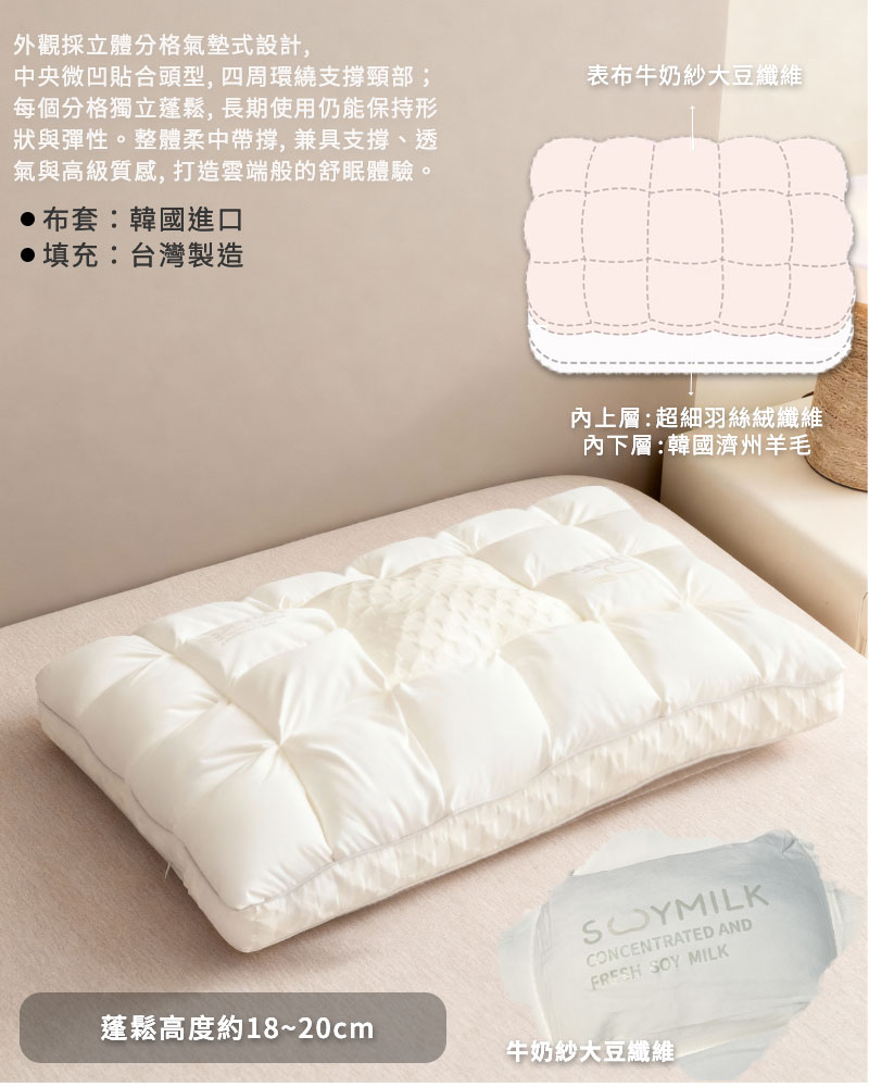 ☆品名:A-nice 韓國濟州羊毛枕☆☆材質 : 表布-大豆牛奶纖維 填充-南亞多孔纖維(內含30%羊毛)☆☆規格:45x75cm (±5cm)☆☆高度蓬鬆:18-20cm (±5cm)布套:韓國進口 填充:台灣製造