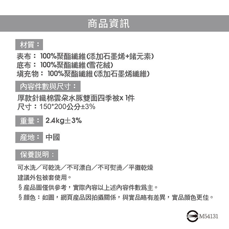 【內容件數與尺寸】數量:雲朵棉雙面四季被x1件(尺寸:150x210cm±3%)