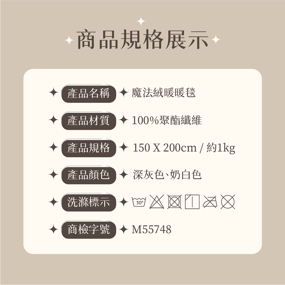 品名:【Pure Sleep 純好眠】魔法絨暖暖毯面料材質:100%聚酯纖維尺寸:150*200cm(±2cm)顏色:深灰色/奶白色產地:中國經銷商:茂榕數位科技有限公司地址:桃園市平鎮區廣東路57巷1號電話:0800-666865【注意事項】※商品圖片為實物拍攝,由於螢幕顯示色差、拍攝光線等因素,照片與實物可能略有差異,請以實物為準。※商品尺寸為人工測量,標示僅供參考,難免與實際商品尺寸略有誤差,誤差尺寸±2cm為國際驗貨標準可接受範圍。※拆封商品後,若有任何問題請先聯繫客服,將有專員為您服務。※注意! 以下說明不屬瑕疵範圍:1. 小於1-3cm尺寸測量誤差、些微不對稱2. (1cm極小污點/摺痕/刮痕/螢幕色差等3. 些微脫線/勾針/線頭/味道/五金刮痕4. 人為造成損壞或使用痕跡【退貨需知】※拆封商品時,為了保障雙方權益,開封時務必錄影留證。※鑑賞期為猶豫期,並非試用期。※提醒您!商品需要全新且包裝完整的情況下,才能辦理退貨退款;棉被屬於個人衛生用品,一旦經拆封或使用,易有接觸肌膚衛生疑慮,商品價值已受損,除非為瑕疵商品,否則無法受理退貨,購買使用前須特別留意,避免影響自身權益!