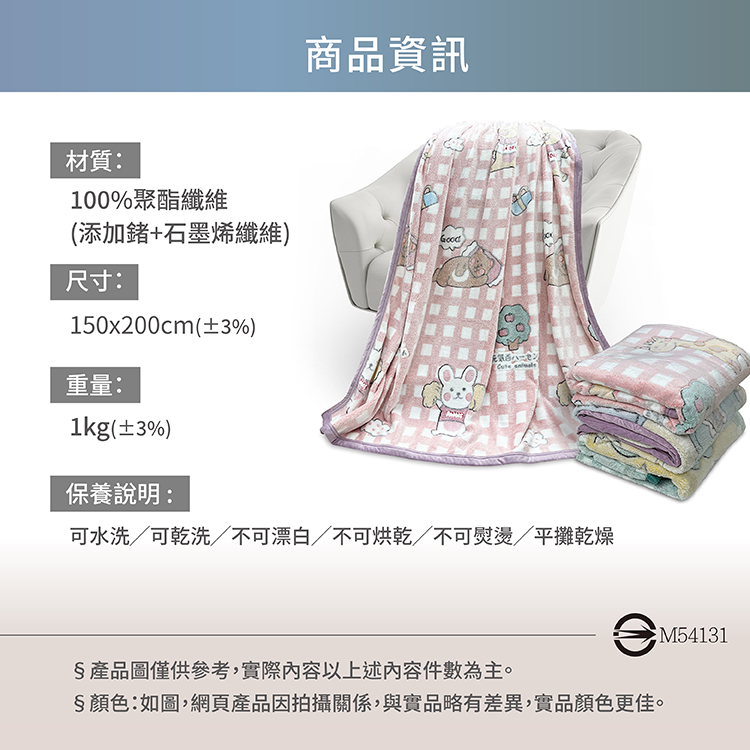 【材質】100%聚酯纖維(添加鍺+石墨烯纖維)【產地】中國【內容件數】鍺+石墨烯保暖毯x1件【尺寸】150x200cm±3%★網頁圖片因拍攝關係,與實品略有差異,實際顏色以出貨為主★產品圖僅供參考,實際內容以上述內容件數為主。★可水洗╱可乾洗╱不可漂白╱不可烘乾╱不可熨燙/★ ※建議使用洗衣袋清洗※不可使用柔軟精※建議新品請先過水後再使用尤佳