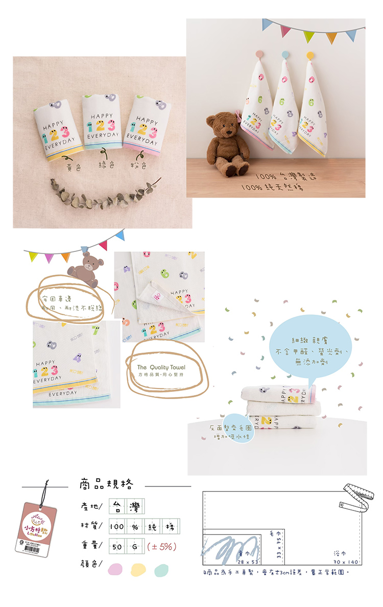 臺灣製造品質安心,100%純棉材質觸感柔細低棉絮,超可愛動物圖案,不論是大人還是小寶貝都可以使用,使用起來超細緻,輕薄快乾溫和去除污垢。