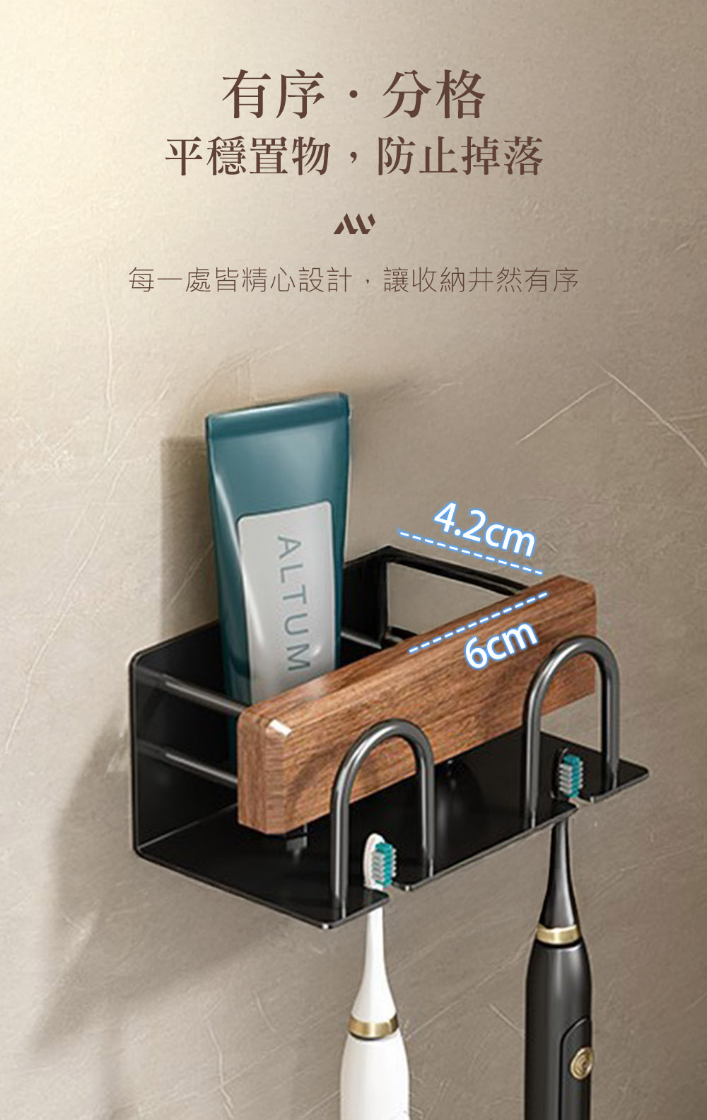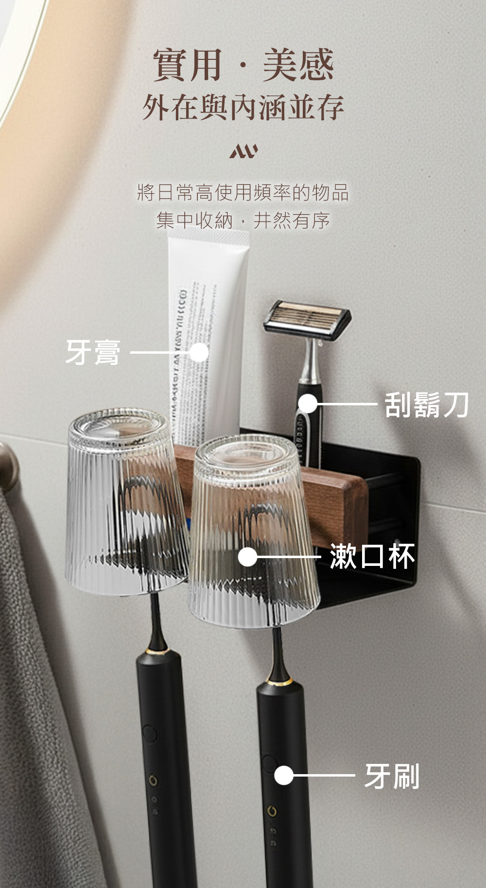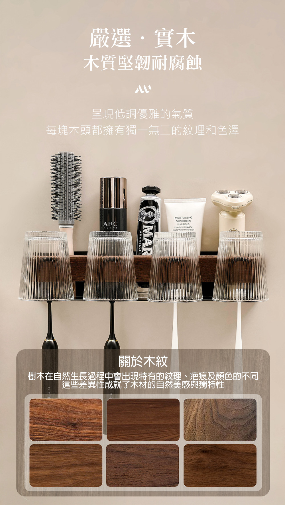 胡桃木牙刷架 附免釘膠 航空鋁 浴室置物架 自黏子母扣 潄口杯架 牙膏架 防水 免釘置物架 置物架 實木置物架