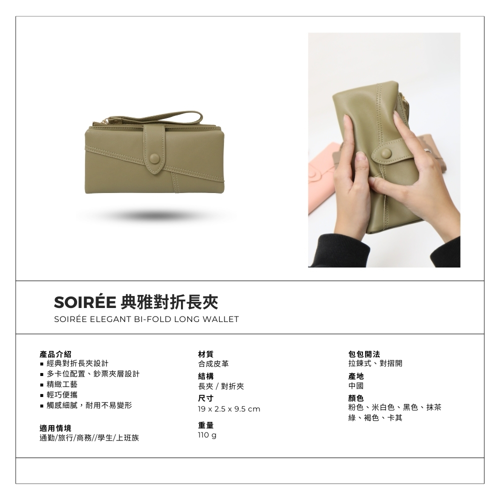 【產品介紹】柔軟細緻合成皮革,質感細膩耐用。★ 經典對折設計,輕巧好攜帶★ 內含9個卡槽(含1個透明證件卡位)★ 一個零錢收納層,兩個雜物收納夾層(鈔票、發票、護身符、雜物等)材質:合成皮革結構:長夾 / 對折夾尺寸:19 x 9.5 x 2.5 cm重量:180 g顏色:櫻花粉、奶茶色、黑色、灰棕、灰綠、卡其#短夾 #皮夾 #女夾 #典雅風#荔枝紋 #韓系 #簡約 #通勤#女性 #上班族 #約會 #禮物首選#情人節禮物 #七夕 #聖誕節禮物