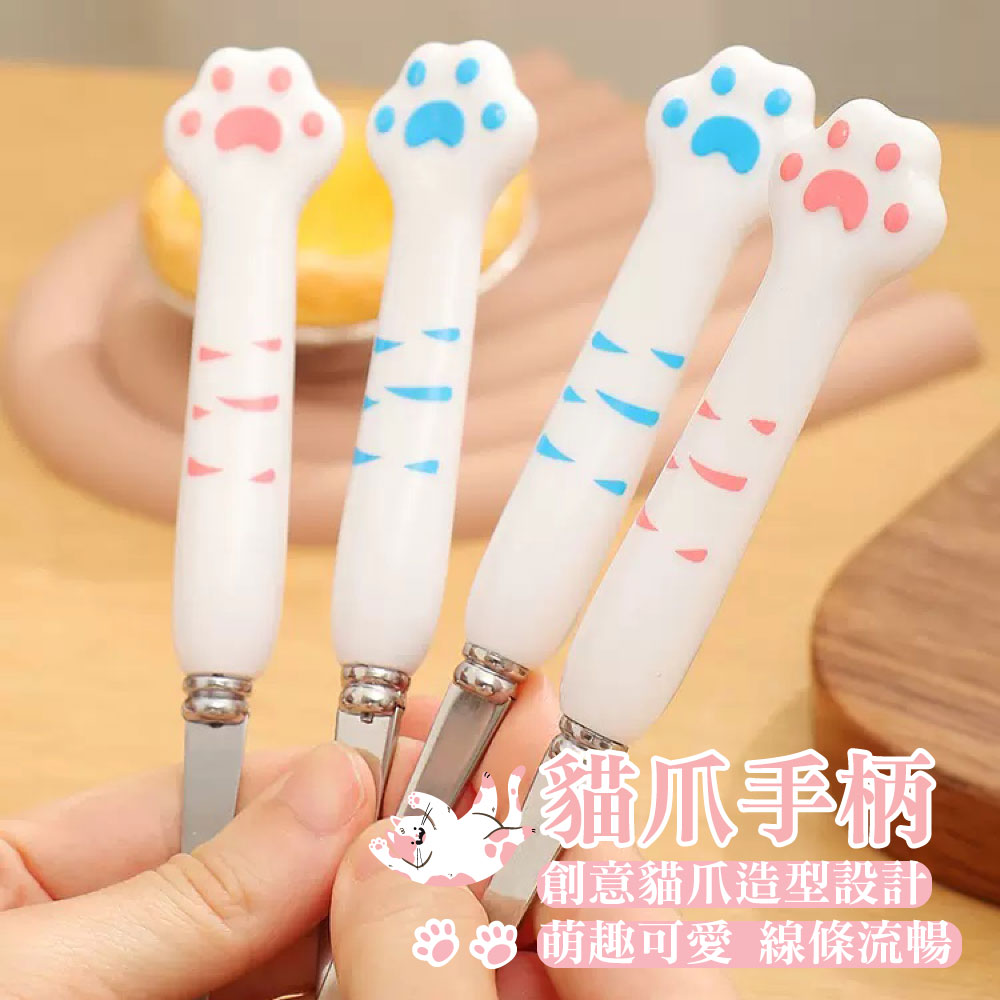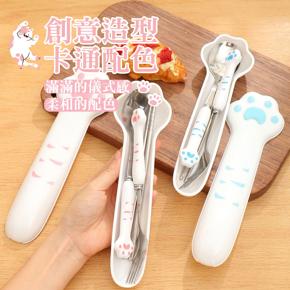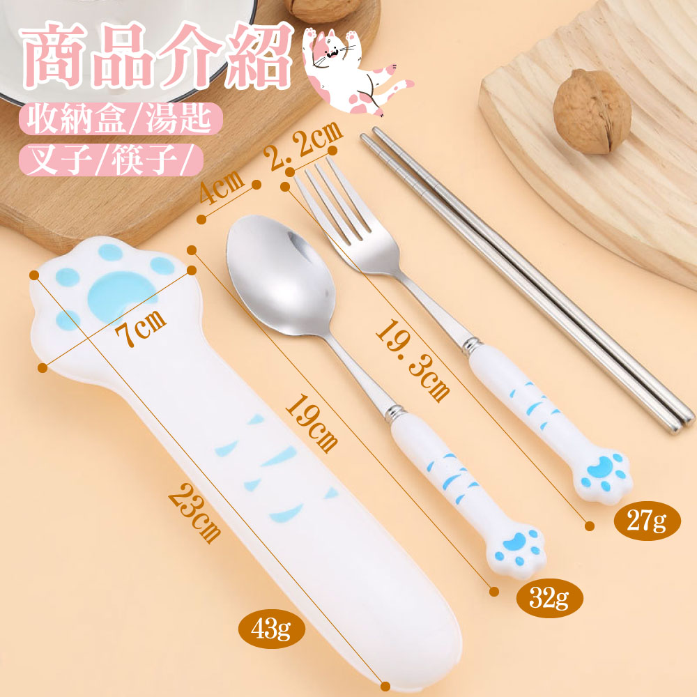 塑膠304不銹鋼【藍色貓爪餐具四件組】 貓咪餐具組 湯匙 筷子 叉子 收納盒 塑膠柄 餐具組 貓掌餐具 不鏽鋼餐具 環保餐具 餐具盒 造型湯匙