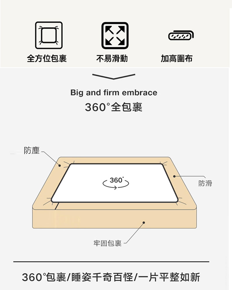 • 床包圓圈式鬆緊帶,強力包覆床墊,緊緊束著床包,不怕移位問題。
