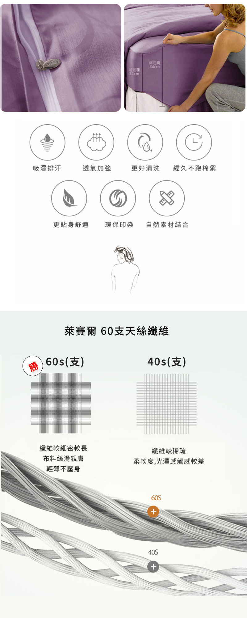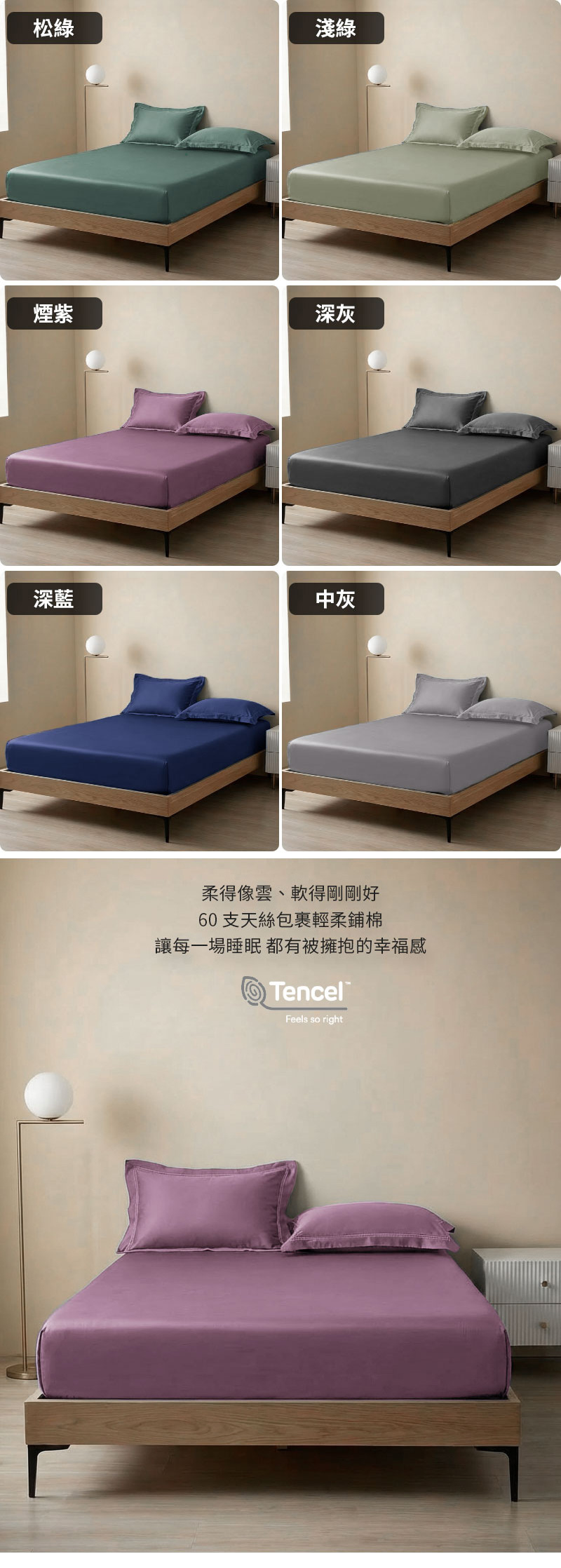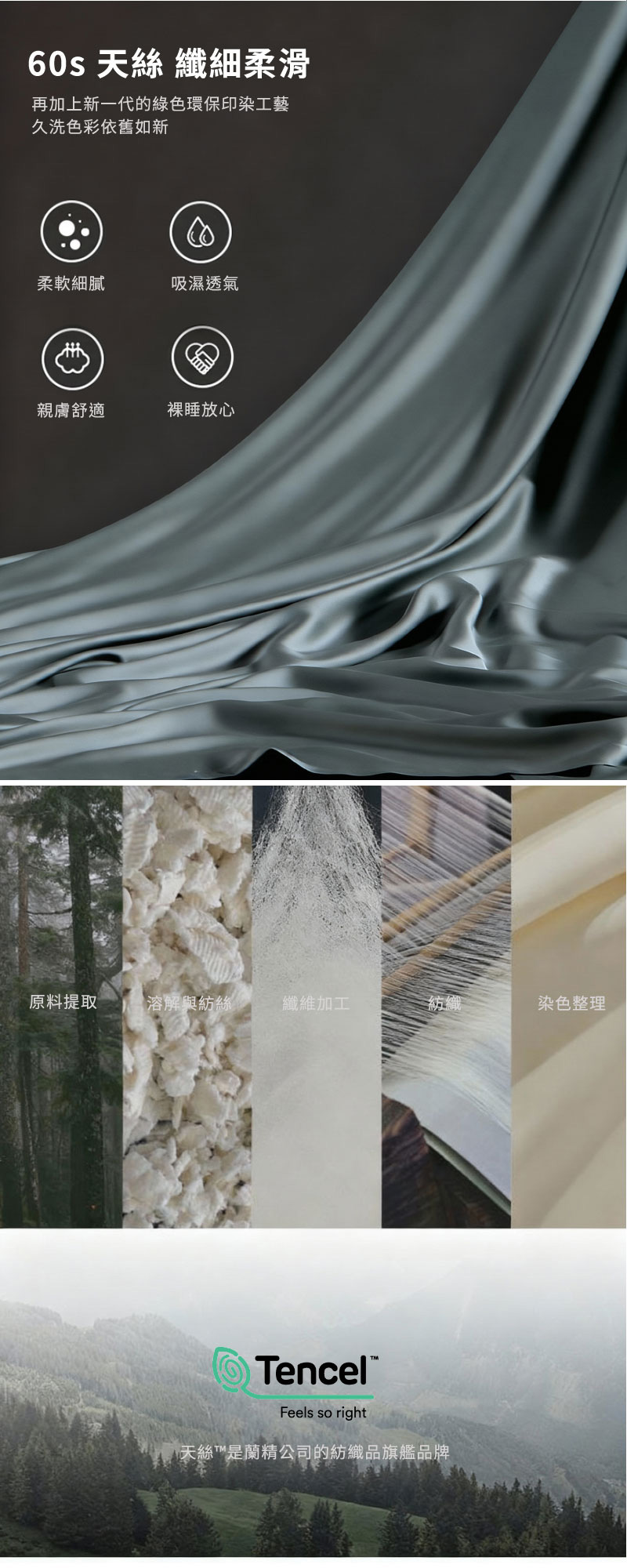 採用 100% 天絲 (60支 萊賽爾纖維),親膚柔滑透氣