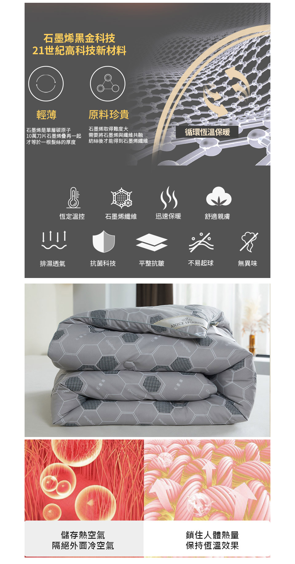 產品名 : A-nice 石墨烯保暖厚冬被材質 : (外布)100%聚酯纖維,(內容物)70%羽絲絨(聚酯纖維)+30%石墨烯纖維。雙人規格:180x210cm(6x7呎) 3KG