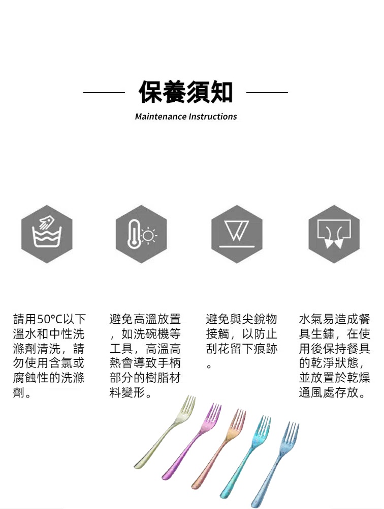 材質 : 純鈦尺寸 : 湯匙19x4cm、叉子19x2cm顏色 : 星空銀產地 : China內容物 : 湯匙x1+叉子x1 組湯叉使用注意事項:- 為避免受傷,請勿拿來玩耍- 請勿讓幼童單獨使用- 家中幼童使用時,需有大人陪同並留意小心安全使用- 請妥善保管於孩童不易取得場所為維持鈦表面美觀,建議清洗後以乾布拭乾,畢免水漬痕跡殘留。鈦餐具商品系列為亮面金屬商品,生產過程會產生細紋乃正常現象。產品尺寸皆為手工測量,因測量方式有所不同,誤差1-2cm屬合理範圍。網頁照片為參考,因拍攝光線與電腦顯示器不同,請以實品為準。追求完美者,請斟酌考慮後購買。謝謝!網路購物您享有商品到貨七天猶豫期,隨時解約退貨之權益,但提醒您注意,商品退貨時必須為全新狀態且完整包裝。