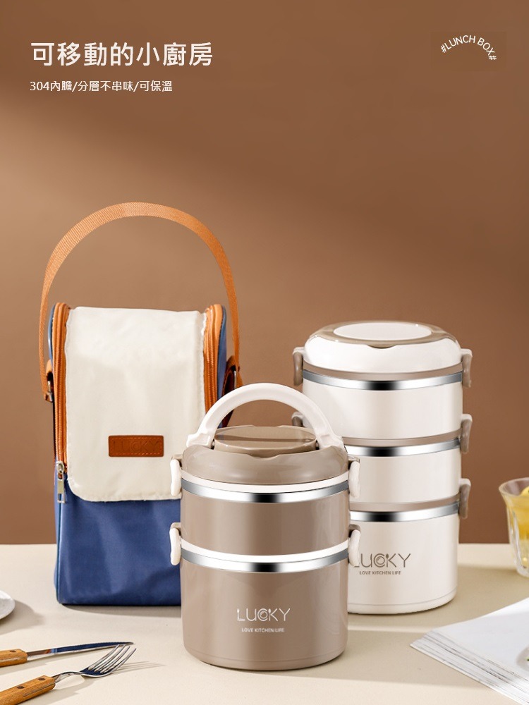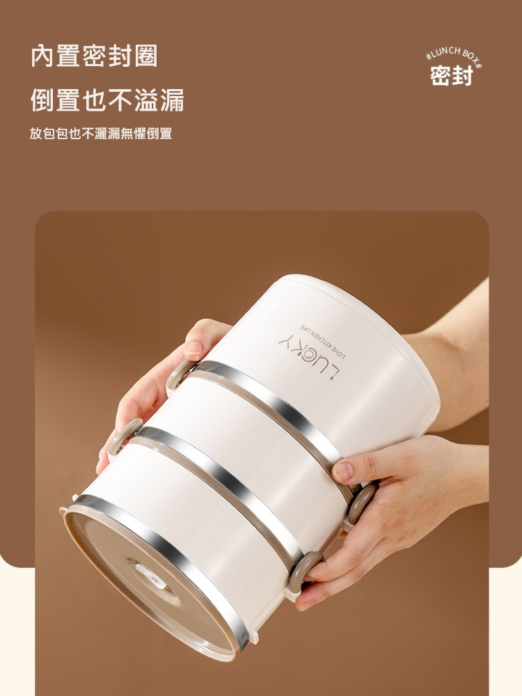 【A&R】升級版日式304不鏽鋼三層保溫飯盒附贈湯匙+保溫袋-微波款2500ML-拿鐵咖