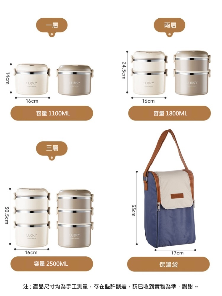 【A&R】升級版日式304不鏽鋼三層保溫飯盒附贈湯匙+保溫袋 微波款 2500ML產品款式:三層 (700ml+700ml+1100ml)產品材質:304不鏽鋼+PP產品容量:三層共2500ML產品尺寸:(700ml+700ml+1100ml)總尺寸:16x20.5cm、折疊湯匙湯匙12x3.2cm、保溫袋17 x33cm產品顏色:拿鐵咖適用溫度:-20度到120度產品適用於辦公、學校、野餐、登山、露營…等產地:China***請微波時務必加蓋並打開氣孔,以利微波加熱***【注意事項】1. 此商品下單規格為微波組合,內容物含保溫飯盒+摺疊湯匙+保溫袋2. 商品顏色會因拍攝、個人電腦螢幕認知不同、生產批次等差異而有所落差,實際顏色請以收到實品為主。3. 由於圖案有不規則排列和規則排列等,實物圖案與圖檔可能略有不同,以實物為準。4. 商品尺寸因測量方式差異,可能有所誤差,敬請見諒。#A&R #升級版 #日式 #304不鏽鋼 #三層 #保溫飯盒 #湯匙 #保溫袋 #微波款 #2500ML #米色 #紅 #米 #咖 #便攜式 #保冷 #便當盒 #露營 #野餐
