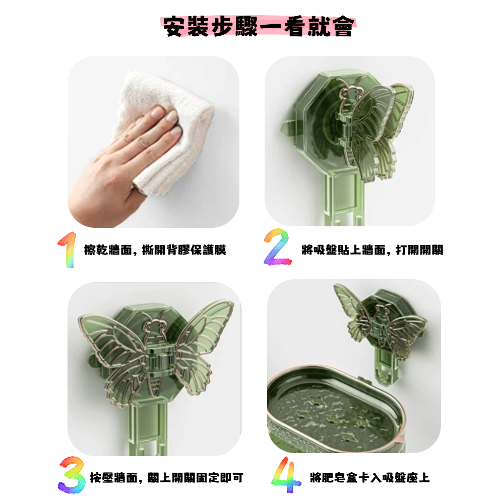 【A&R】北歐風輕奢蝴蝶美型雙層香皂盒 免打孔吸盤款 顏色 : 晶亮白材質 : PET → 外層透明蓋或盒身(高透亮)、PC / ABS → 結構與支架部分(耐重 防摔)尺寸 : 134x85x139mm產地 : China安裝步驟 :1.擦乾牆面,撕開背膠保護膜2.將吸盤貼上牆面,打開開關3.按壓牆面,關上開關固定即可4.將肥皂盒卡入吸盤座上溫馨提醒 : 尺寸皆為人工測量略有誤差,顏色因顯示器而有所不同,請以收到實物為主。