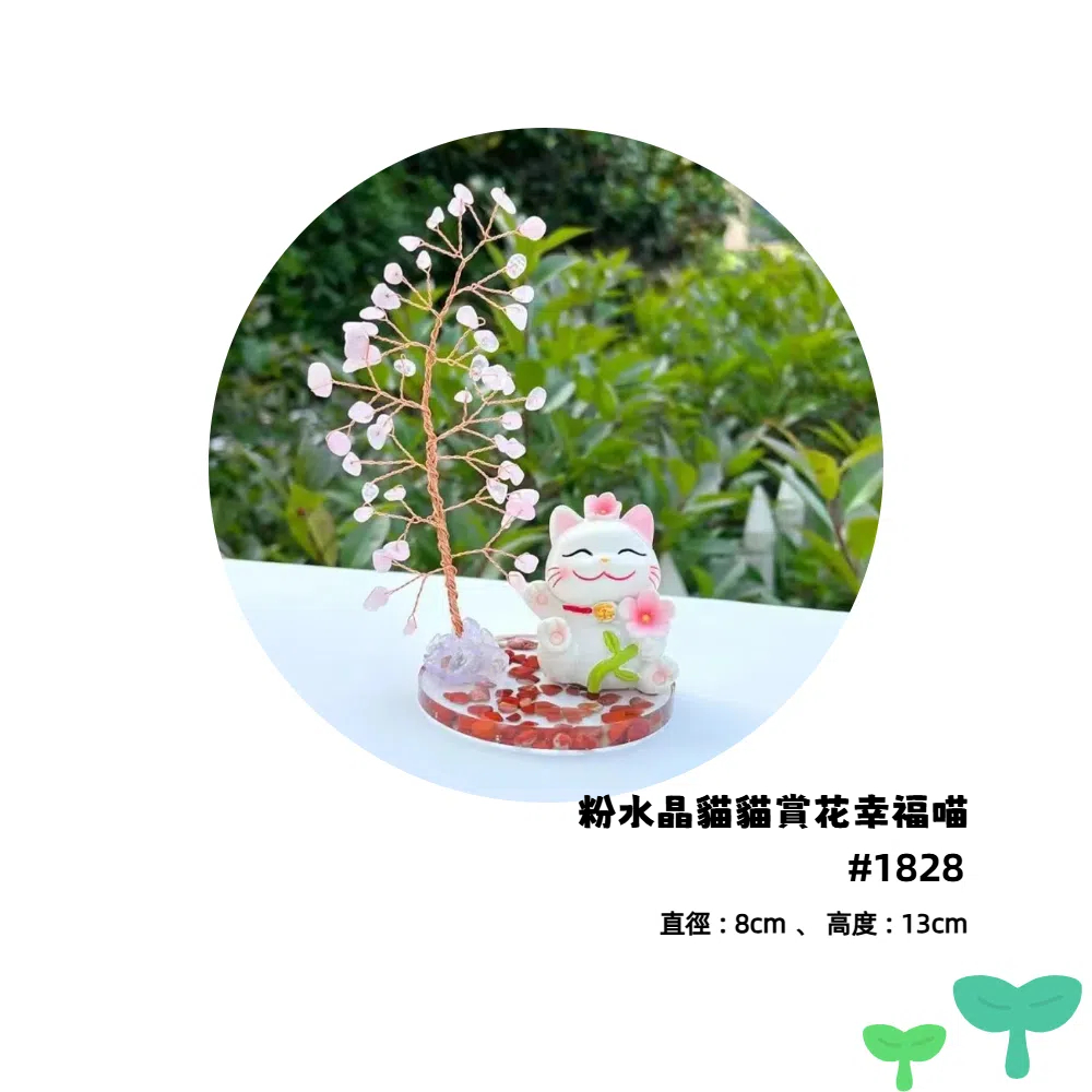 款式 : 粉水晶貓貓賞花幸福喵材質 : 琉璃、粉水晶、銅線、滴膠底座尺寸 : 直徑8cm、高度13cm重量 : 127g