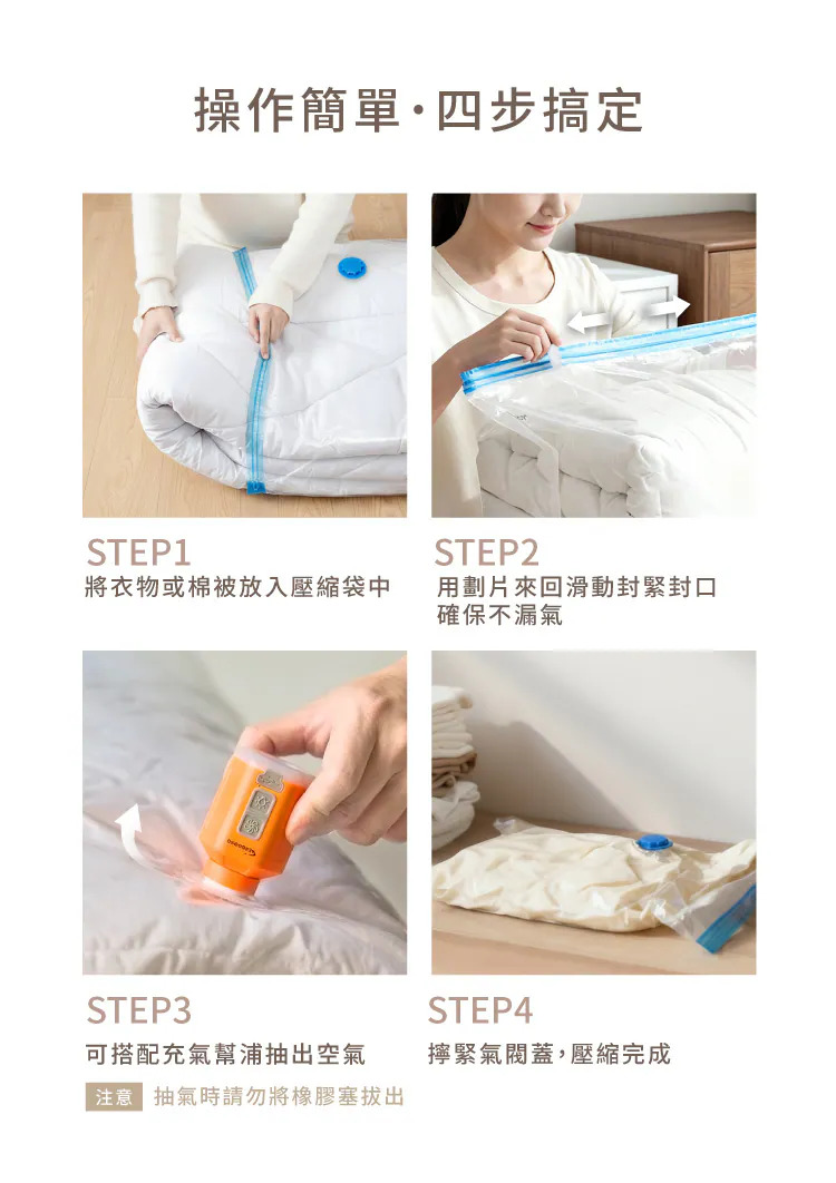 ◇優質PE材質,無毒無臭安心使用 ◇具韌性耐撕扯不易破,可重複使用 ◇整潔收納衣物,防潮防蟲 ◇防逆流氣閥,重重保護不漏氣 ◇可搭配Aerogogo充氣幫浦使用