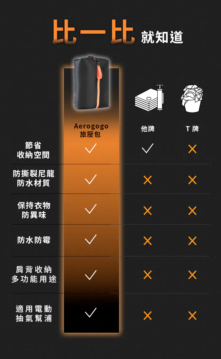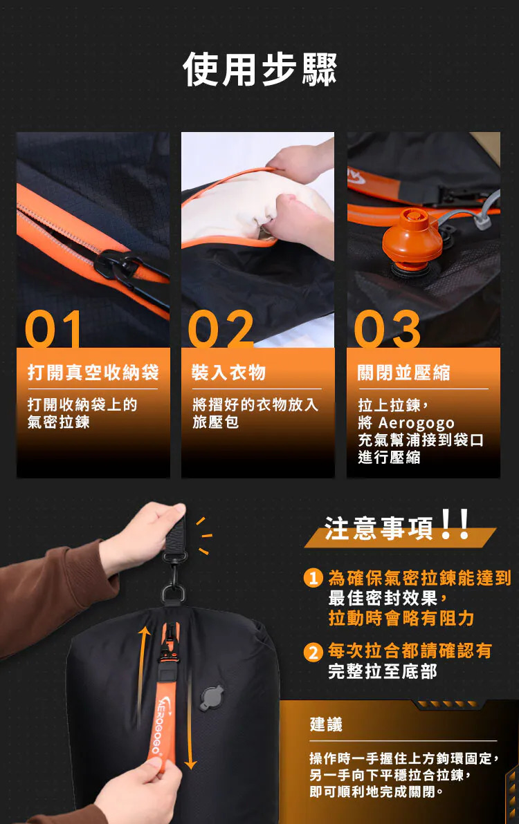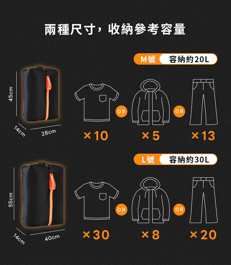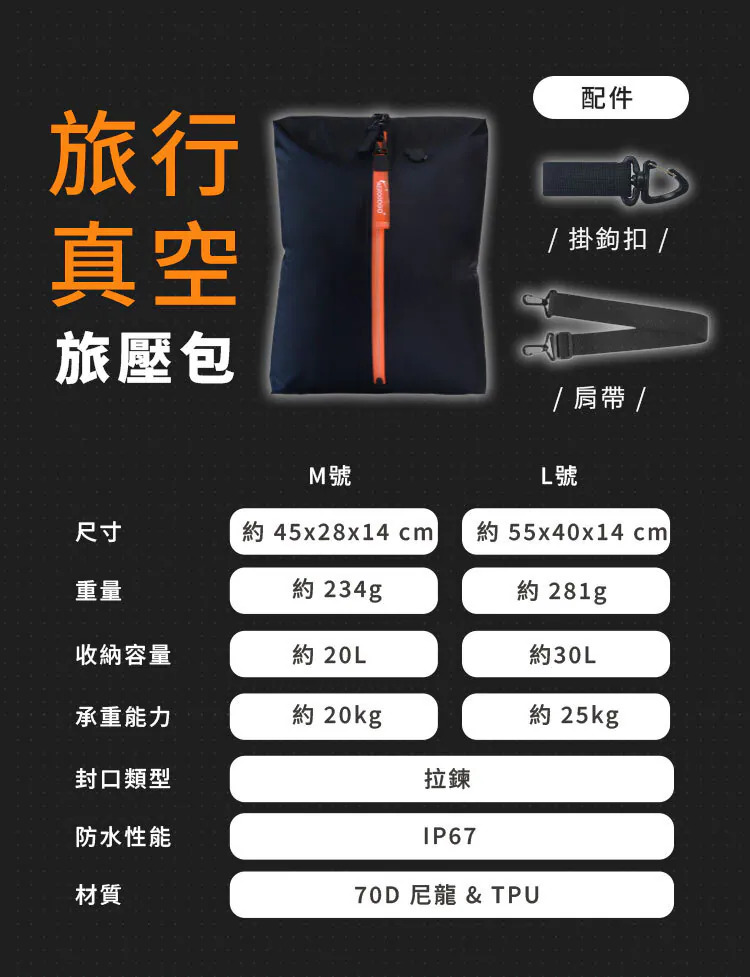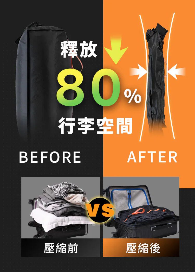 ◇本產品需搭配抽氣裝置才能達到最佳收納效果 ◇釋放80%行李空間,收納更簡單 ◇IP67防水性能搭配高密度防水拉鍊 ◇出遊旅行/外地露營 多場景適用