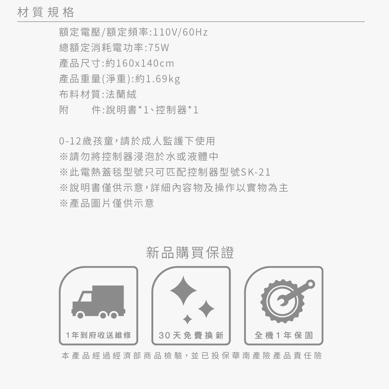 額定電壓/額定頻率:110V/60Hz總額定消耗電功率:75W產品尺寸:約160x140cm產品重量(淨重):約1.69kg布料材質:法蘭絨附 件:說明書*1、控制器*1