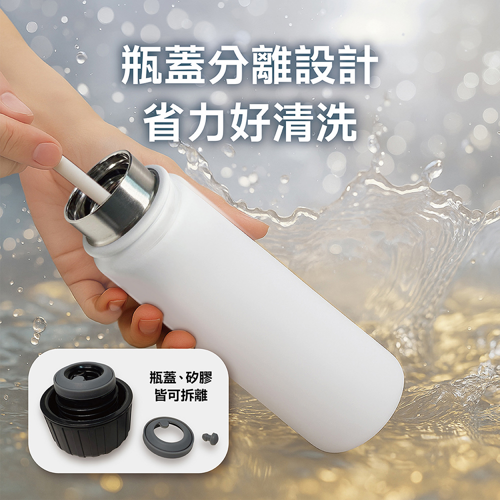 .最大容量500 ml.瓶蓋洩壓結構 , 開蓋時即釋放壓力 , 防止碳酸飲料噴出或飛濺.內膽鏡面加工 , 光滑的表面可保持氣泡並減少污漬殘留.瓶蓋分離式設計 , 矽膠皆可拆離 , 省力好清洗.真空斷熱 , 長效保溫 , 冷、熱兩用.瓶底止滑墊 , 放置更安心
