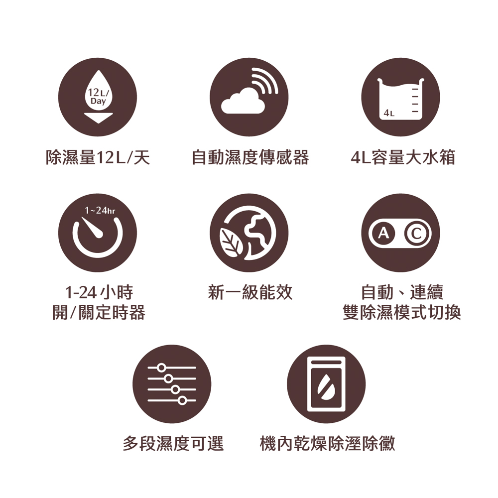 .除濕量12L/天.自動濕度傳感器.4L容量大水箱.1-24小時 開/關定時器.新一級能效.多段濕度可選.機內乾燥除溼除黴