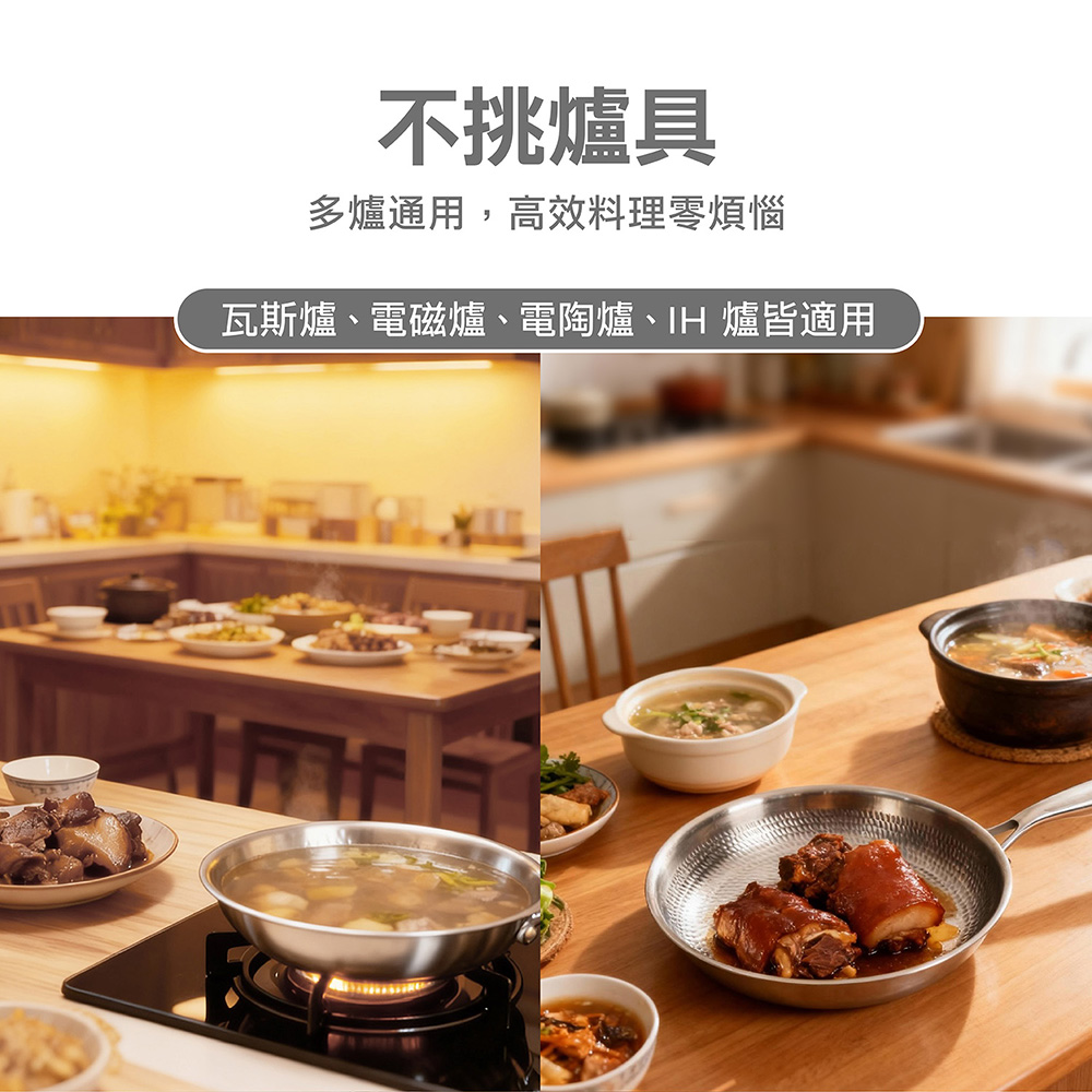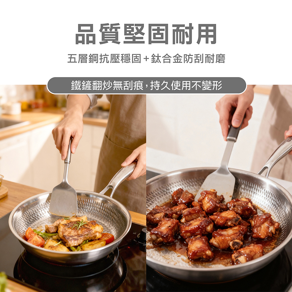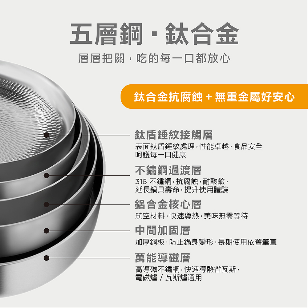 .五層材質,快速烹飪.食品安全,零塗層.不挑爐,美味不受限.專利錘紋,受熱更均勻.食品級安全,316 不鏽鋼.透明烹飪,4mm 高透鋼化玻璃蓋