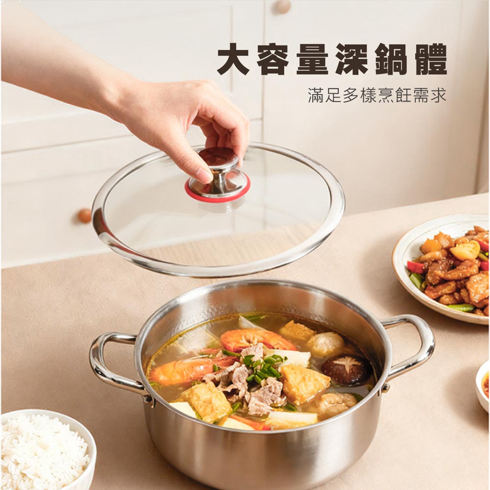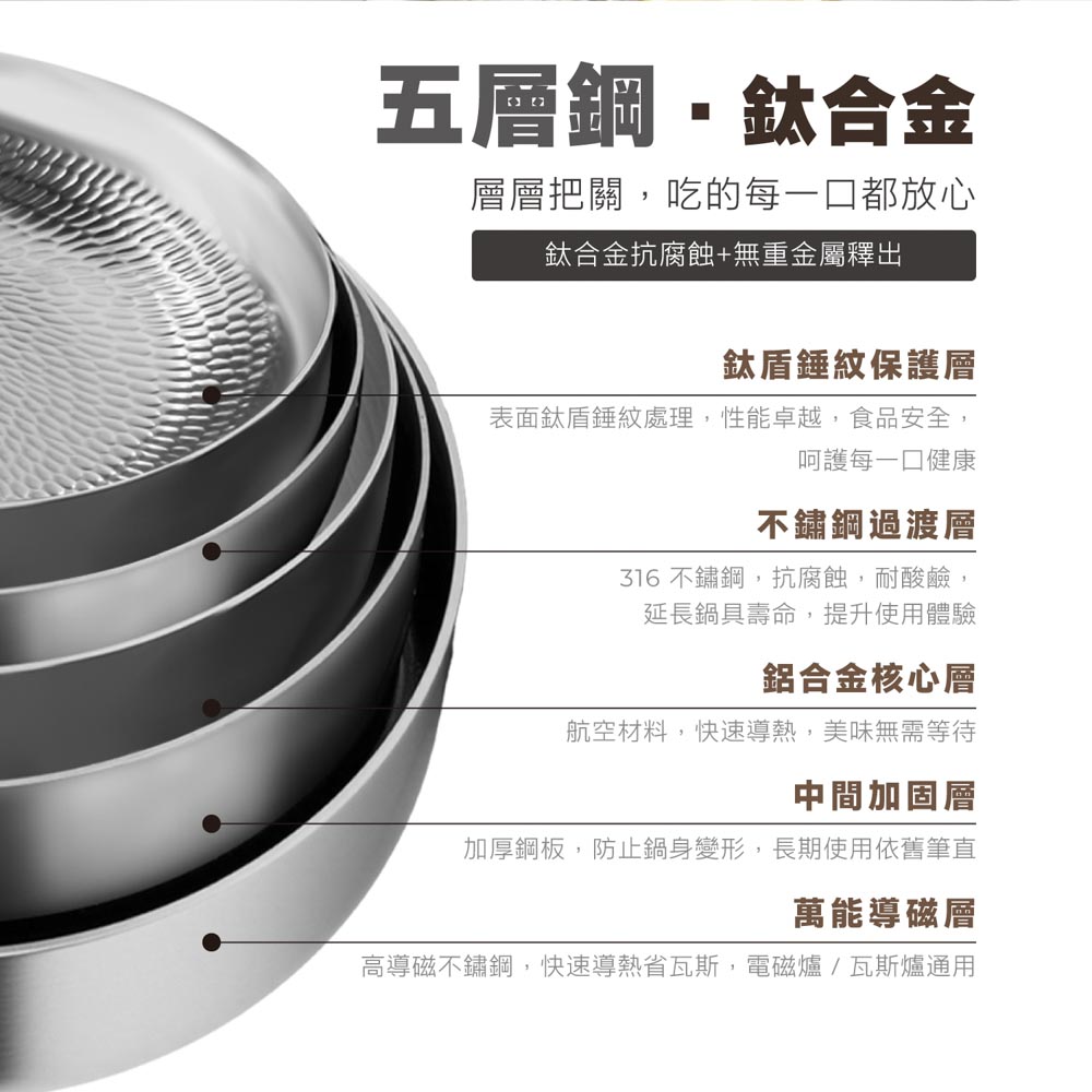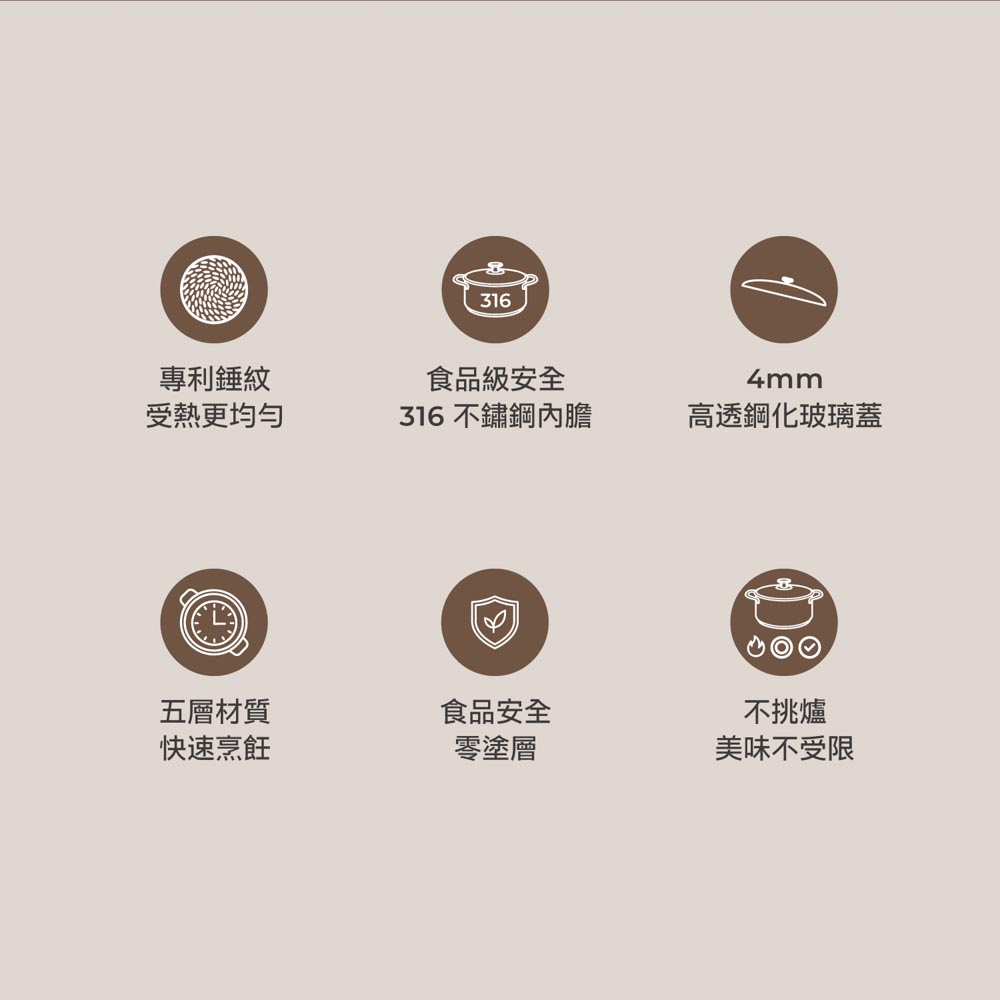 .五層材質,快速烹飪.食品安全,零塗層.不挑爐,美味不受限.專利錘紋,受熱更均勻.食品級安全,316 不鏽鋼.透明烹飪,4mm 高透鋼化玻璃蓋