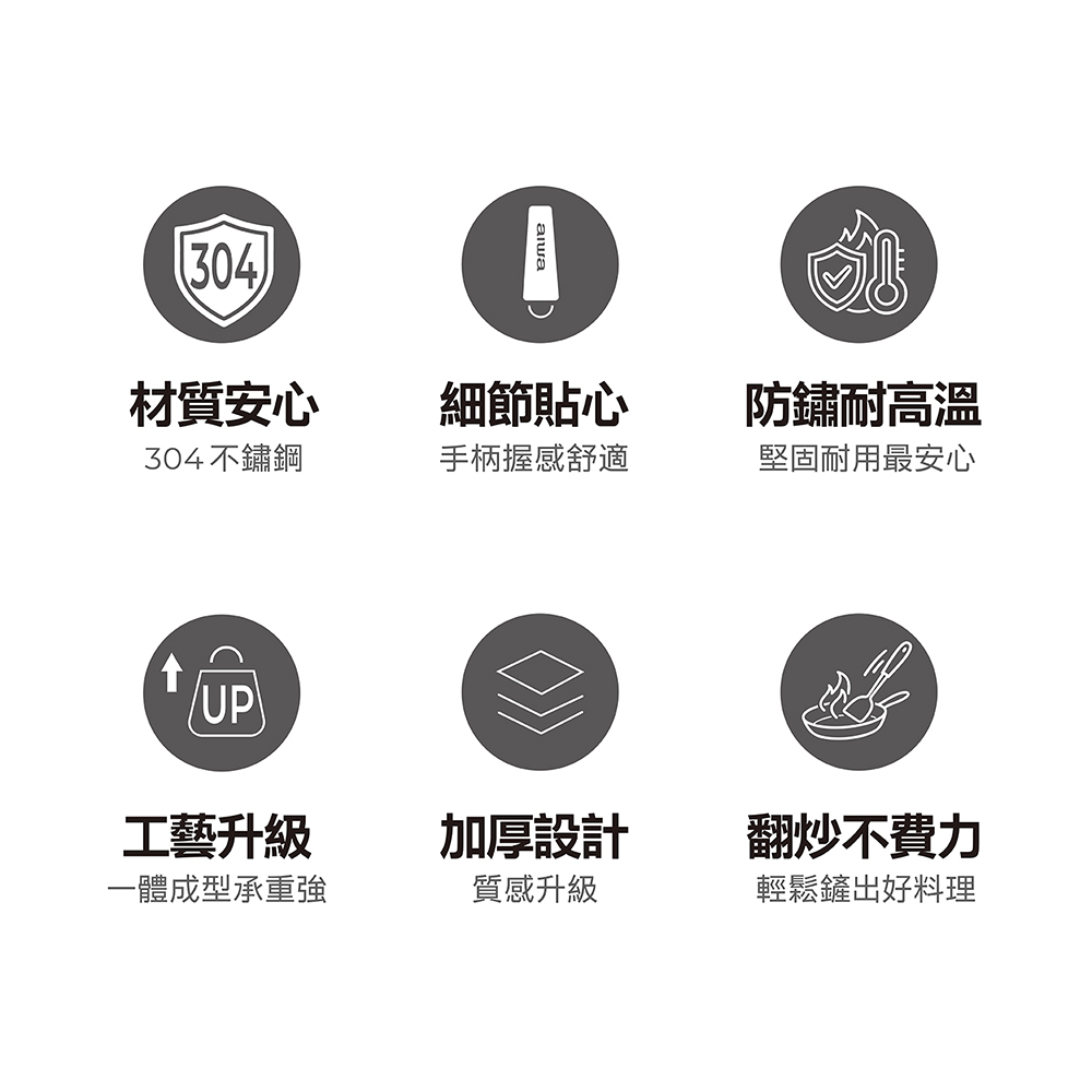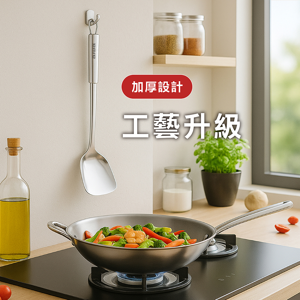 .304不鏽鋼,食品接觸用材質,安心又耐用.細節貼心,手柄握感舒適.防鏽耐高溫,堅固耐用最安心.工藝升級,一體成型承重強.加厚設計,質感升級.翻炒不費力,輕鬆鏟出好料理