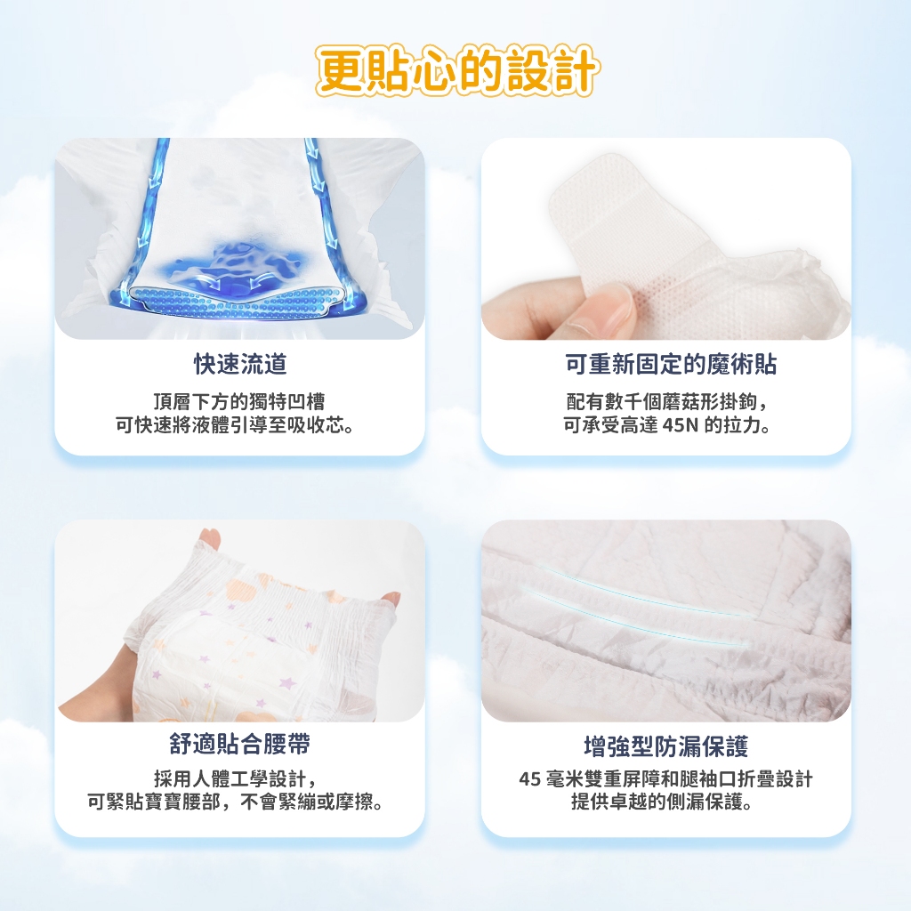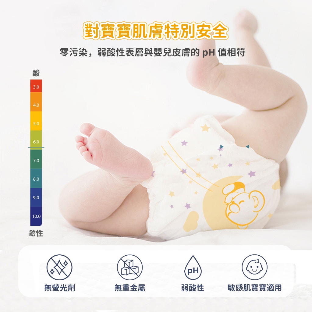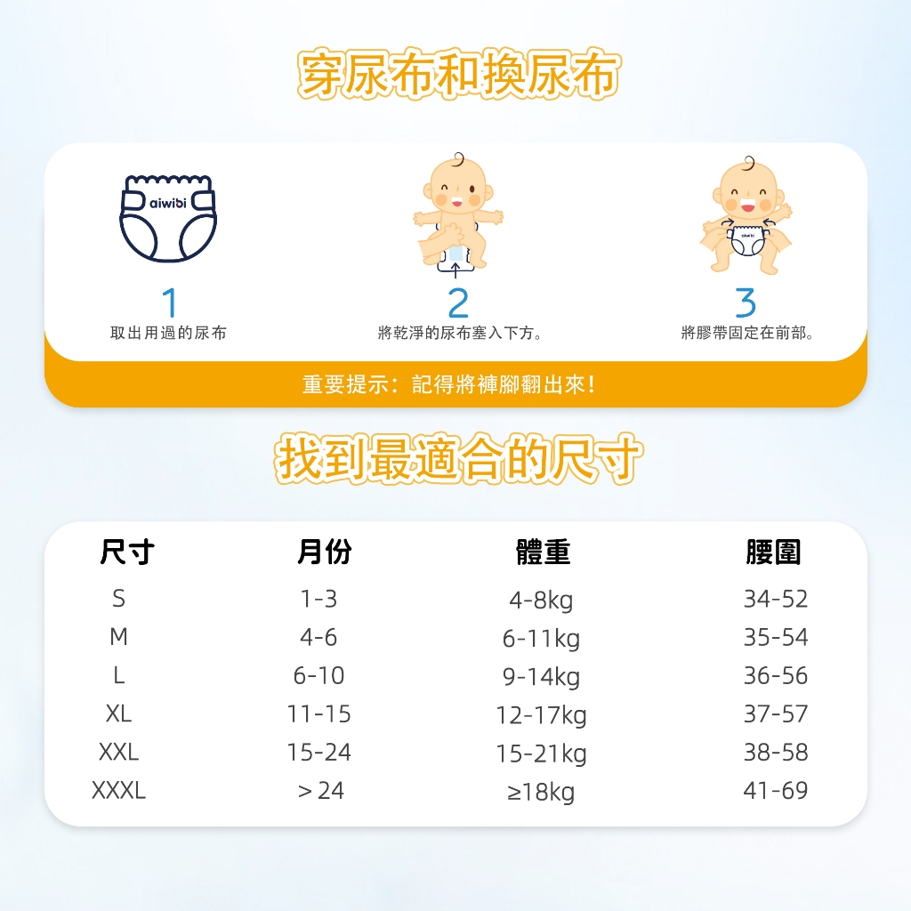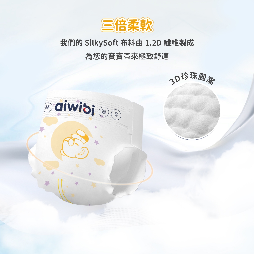 🐨Aiwibi品牌介紹Aiwibi是來自澳洲的嬰兒護理品牌,Aiwibi嬰兒紙尿褲和嬰兒褲通過了德國Dermatest臨床測試,被評為“優秀”,這是世界上最高的品質測試標準。此外,它還獲得了ISO9001、CE、GMPC和FDA標準的認證。Aiwibi代表著對提高嬰兒安全和全面護理的負責任的態度。 Aiwibi的忠實客戶群已擴展到90多個國家。Aiwibi正致力於成為您的第一和最佳選擇,並始終提供超越您期望的服務。🔥 口號: 從最微小的事開始累積,彼此充滿愛的照顧。 愛薇彼~最愛你。🔥 品牌:aiwibi🔥 上層:熱風無紡布聚乙烯/聚對苯二甲酸乙二醇酯吸水層:高吸水性聚合物 、木漿背層:紡粘無紡布聚乙烯/聚對苯二甲酸乙二醇酯,薄膜聚烯烴🔥 產地:中國🔥 保存期限:3年🧡 *產品特點介紹:1,面層SilkySoft Fabric™我們的 SilkySoft Fabric™ 採用 1.2D 纖維製成,比人類頭髮細十倍,觸感如羽毛般柔軟絲滑,帶來極致舒適感。2,PE膜(技術)獨家 MicroAiry Film™,設計有數十億個超細微孔。這種透氣 PE 薄膜可讓空氣自由流動,同時防止水通過,使透氣性提高 50%3,芯體(技術)採用雙重芯體吸收技術,天然木漿加速吸收,而日本住友 SAP 確保最大容量,將吸收率提高 50%,提供卓越的夜間保護4,護圍增強型雙重防漏保護我們的防漏保護採用 45 毫米雙重屏障和腿部袖口折疊設計,可提供卓越的側漏保護5,吸尿量長達 14 小時的保護2 秒鐘瞬間鎖住液體,採用獨特的 Dual Absorbent Core™,可快速吸收水分並容納高達 2000 毫升。提供整夜保護和持久舒適,讓您的寶寶保持乾爽無洩漏6,腰圍(技術)Comfort Fit Waistband™轉為完美貼合設計,緊貼寶寶腰部,不會緊繃。貼身舒適,不會壓迫寶寶腹部,保持安全。7,魔術貼可重複固定的魔術貼這款魔術貼採用 3M 防水材質製成,具有數千個蘑菇形掛鉤,可牢固地抓住前腰帶,可承受高達 45N 的拉力以防止掉落。8,面層紋路3D珍珠圖案減少皮膚接觸面積和摩擦,透氣性提高30%,同時溫柔呵護寶寶嬌嫩的肌膚9,尿顯遇尿時顏色會從黃色變成綠色,可以快速輕鬆地知道何時需要更換