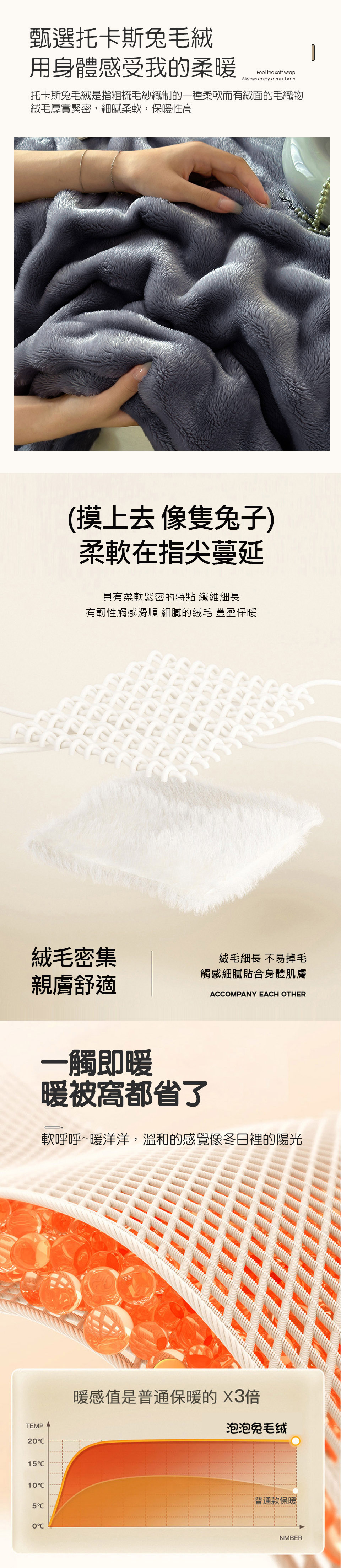 【產品特色】 享受親柔舒眠的體驗!托卡斯兔絨毯;採用泡泡壓花工藝,美觀實用,讓您無論在沙發、電腦桌前休憩或是床鋪上睡眠,都能享有即刻的保暖!簡約素雅的顏色,適合全家大小使用!親膚舒適,令人愛不釋手的聖品,冬季保暖最佳首選喔~~【產品配件/尺寸】商品組合:托斯卡泡泡兔毛絨毯 x 1件 尺寸:150x200cm ±5% 材質:托斯卡兔毛絨 (100%聚酯纖維)保養方式:可水洗、機洗(建議放入洗衣袋中洗滌)使用中性洗滌劑。請勿漂白。洗滌後;於暖日中曝曬。可使用低溫烘乾。 顏色:如圖,網頁產品因拍攝關係,與實品略有差異,實品顏色更佳 。產品圖僅供參考,不含拍攝道具,實際內容以包裝規格為主。※因布料裁切位置的不同,部份花版可能會與商品圖略有出入,請以收到的實品為主。◆注意事項: 網路購物享有鑑賞期,非試用期,個人衛生用品,經拆封使用後恕不接受退換貨。(請於鑑賞期內確定尺寸規格無誤再使用)商品如經拆封、使用、下水、或拆解以致缺乏完整性及失去再販售價值時,恕無法退貨!