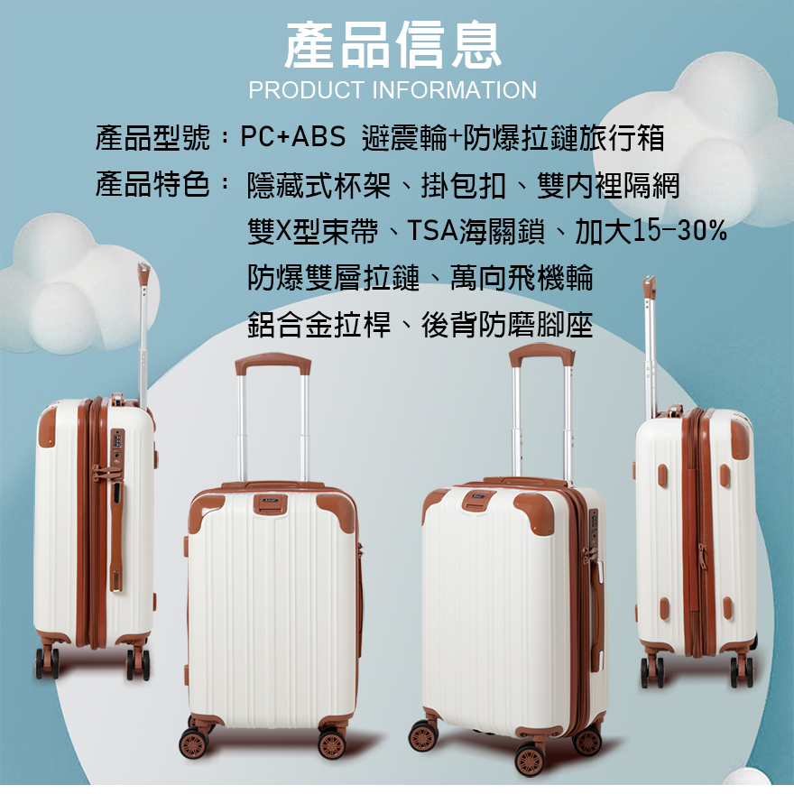 特色:PC+ABS磨砂、隱藏式杯架、後背防磨腳座、防爆雙層拉鏈、掛包扣、TSA海關鎖、雙內裡隔網、雙X型束帶、鋁合金拉桿、60mm避震雙排輪、加大15-30%