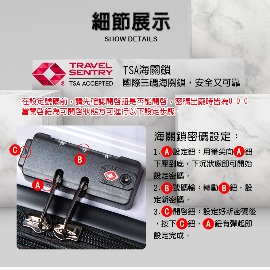 特色:PC+ABS防爆拉鏈、掛包扣、雙內裡隔網、雙X型束帶、TSA海關鎖、鋁合金拉桿、360度飛機輪、加大15-30%
