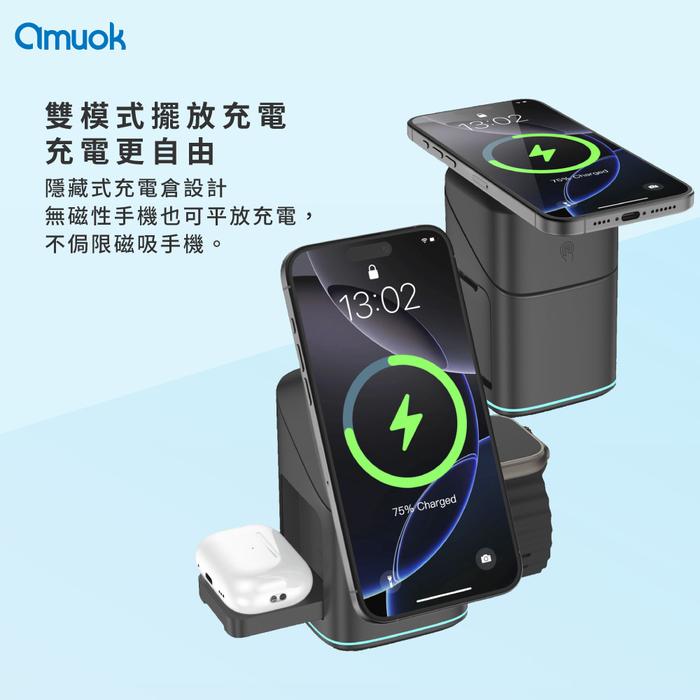 【amuok】AK-WI01 Qi2認證 萬能三合一磁吸無線充電站(無線充電座 充電器 AppleWatch充電 AirPods充電)