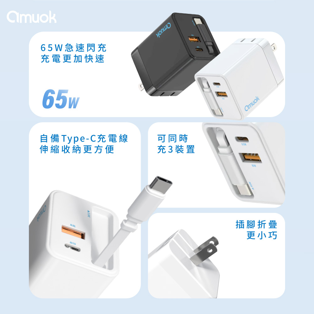 【amuok】65W GaN氮化鎵自帶線快充頭 電源供應器 充電頭 充電器 豆腐頭(兩色可選)