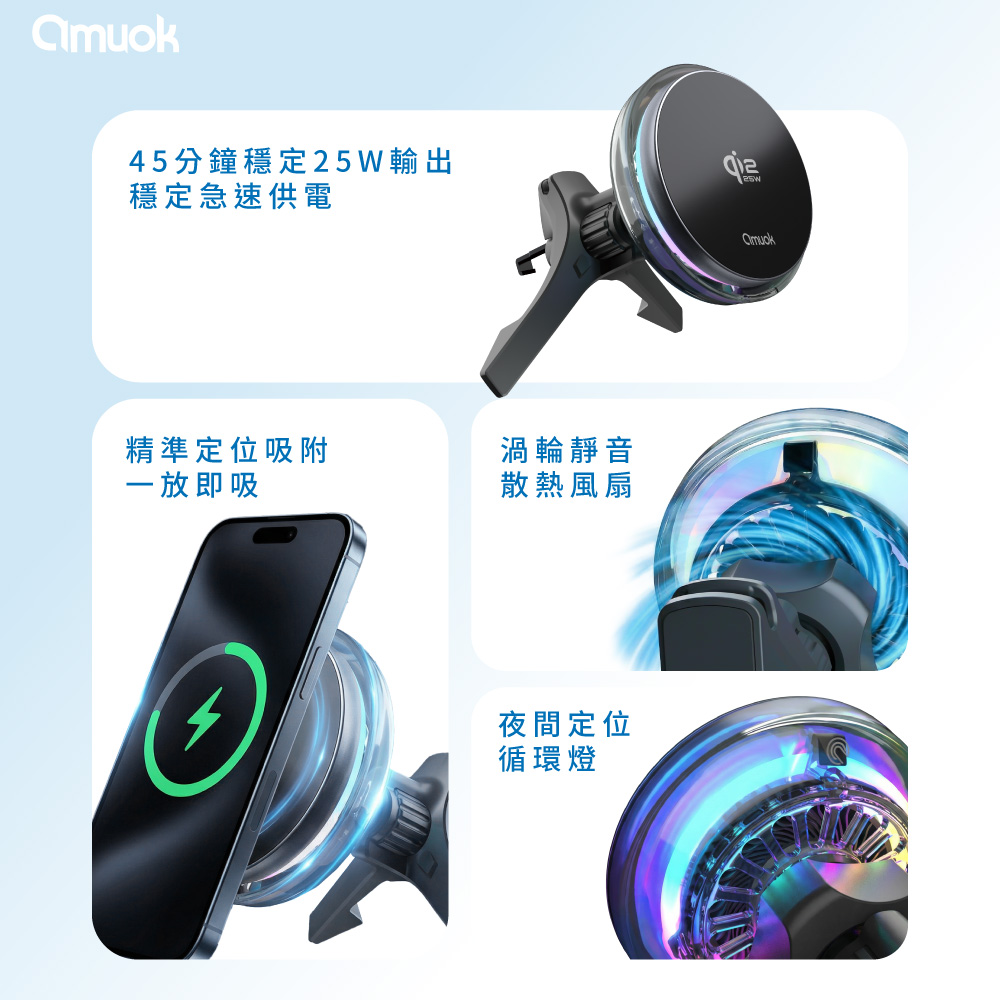 ● Qi2.2官方認證,安全效率再升級● 渦輪靜音散熱風扇,提升充電效率● 夜間定位顯示燈,充電時自動關閉● 25W高效快充 📌需搭配升降壓車充使用,單孔輸出至少30W、9V/3A。(可搭備【amuok】 All Power霸力瓦120W快充車充使用)📌若瓦數不夠、分接太多電器、會造成汽車供電不足而無法使用。📌適用水平式出風口,不適用圓形出風口。〈商品規格〉amuok C25溫控車載無線充型號:AK-MC03材質:ABS+PC輸入:5V⎓2A,輸出:5V⎓5W輸入:9V⎓2A,輸出:5V⎓5W,7.5V⎓7.5W輸入:12V⎓2A,輸出:5V⎓5W,7.5V⎓7.5W,9V⎓15W輸入:15V⎓3A,輸出:5V⎓5W,7.5V⎓7.5W,9V⎓15W,11V⎓25W最大總輸出功率:25W工作頻率:360KHz工作溫度:0°C ~ +35°C充電距離:≦4mm產品淨重:±95g產品尺寸:±直徑6.2cm磁鐵吸力:1.6Kg適用手機:iPhone12~17系列,以及其他支援無線充電並具有MagSafe連接條件(搭配MagSafe磁吸殼或鐵環)的手機。📌請注意,啟動無線快充功能需要搭配PD30W及以上車充連接方可啟動無線快充功能。BSMI:R56284NCC:CCAP25LP6240T8