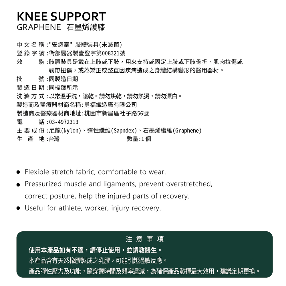 1、商品組合/規格:【anytime安您泰】石墨烯護膝VA-5851(未滅菌)2入2、醫療器材許可證◆核定品名:"安您泰"肢體裝具(未滅菌)◆核准字號:衛部醫器製壹登字第008321號◆藥商名稱:勇福織造廠有限公司◆製造廠名稱:勇福織造廠有限公司◆製造廠地址:桃園市新屋區社子路56號3、藥商許可執照◆許可執照字號:北市衛器販(信)字第6201077996號◆藥商名稱:葛拉蒂國際企業有限公司◆藥商地址:新北市三重區重新路4段256號1樓◆藥商諮詢專線電話:02-2586-55384、製造日期:如外包裝標示5、有效期間或保存期限:如外包裝標示7、「消費者使用前應詳閱產品說明書」