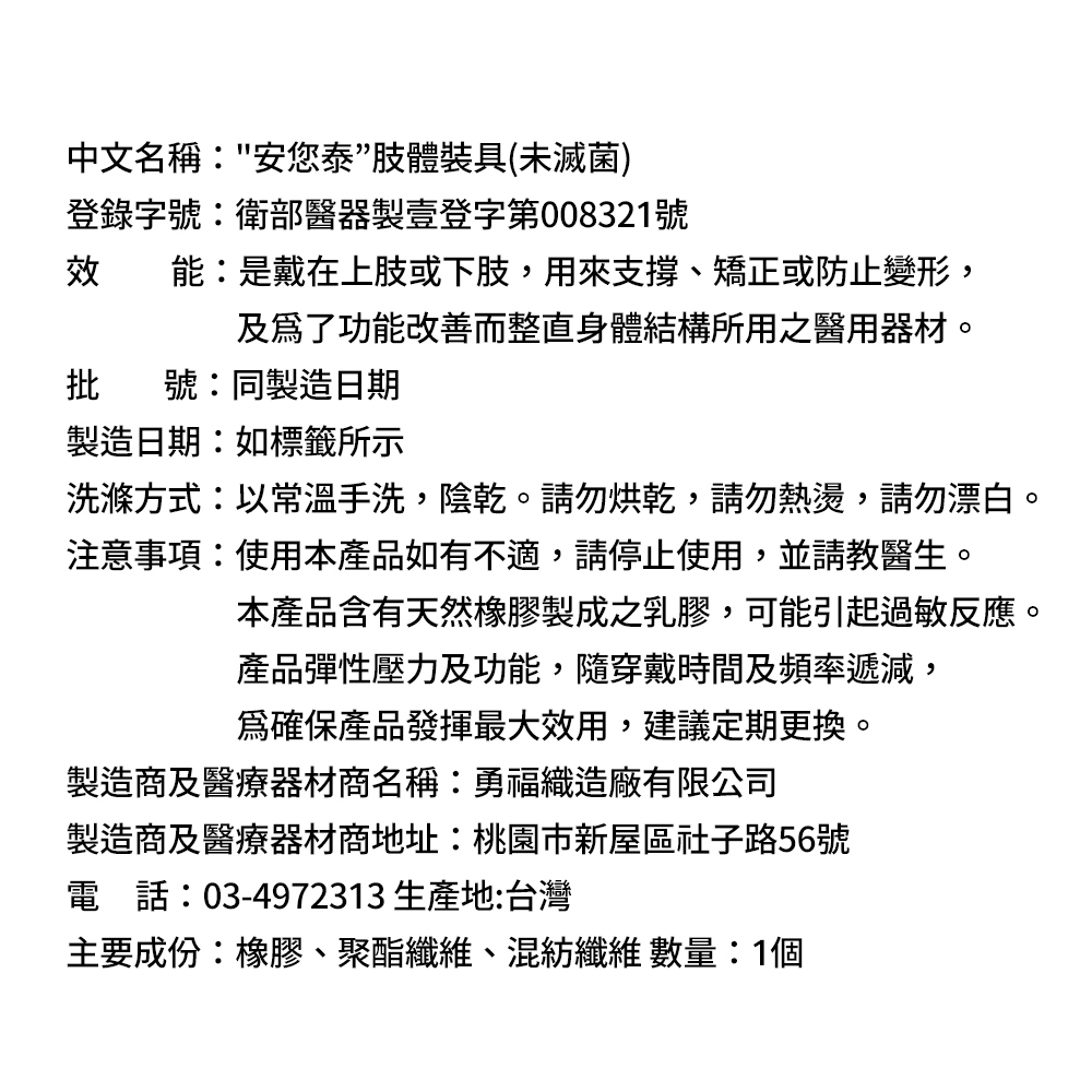1、商品組合/規格:【anytime安您泰】高彈力透氣護腕VA-7101(未滅菌)2入2、醫療器材許可證◆核定品名:"安您泰"肢體裝具(未滅菌)◆核准字號:衛部醫器製壹登字第008321號◆藥商名稱:勇福織造廠有限公司◆製造廠名稱:勇福織造廠有限公司◆製造廠地址:桃園市新屋區社子路56號3、藥商許可執照◆許可執照字號:北市衛器販(信)字第6201077996號◆藥商名稱:葛拉蒂國際企業有限公司◆藥商地址:新北市三重區重新路4段256號1樓◆藥商諮詢專線電話:02-2586-55384、製造日期:如外包裝標示5、有效期間或保存期限:如外包裝標示7、「消費者使用前應詳閱產品說明書」